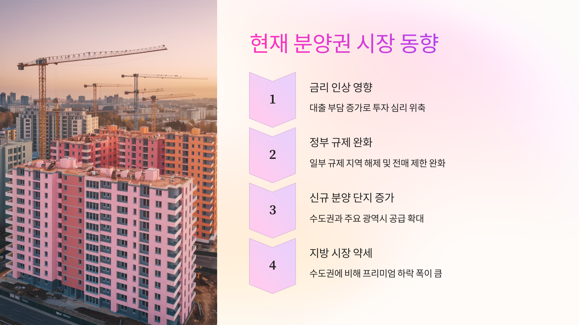 ✔ **금리 인상 영향** → 대출 부담 증가로 투자 심리 위축 ✔ **정부 규제 완화** → 일부 규제 지역 해제 및 전매 제한 완화 ✔ **신규 분양 단지 증가** → 수도권과 주요 광역시 공급 확대 ✔ **지방 시장 약세** → 수도권에 비해 프리미엄 하락 폭이 큼