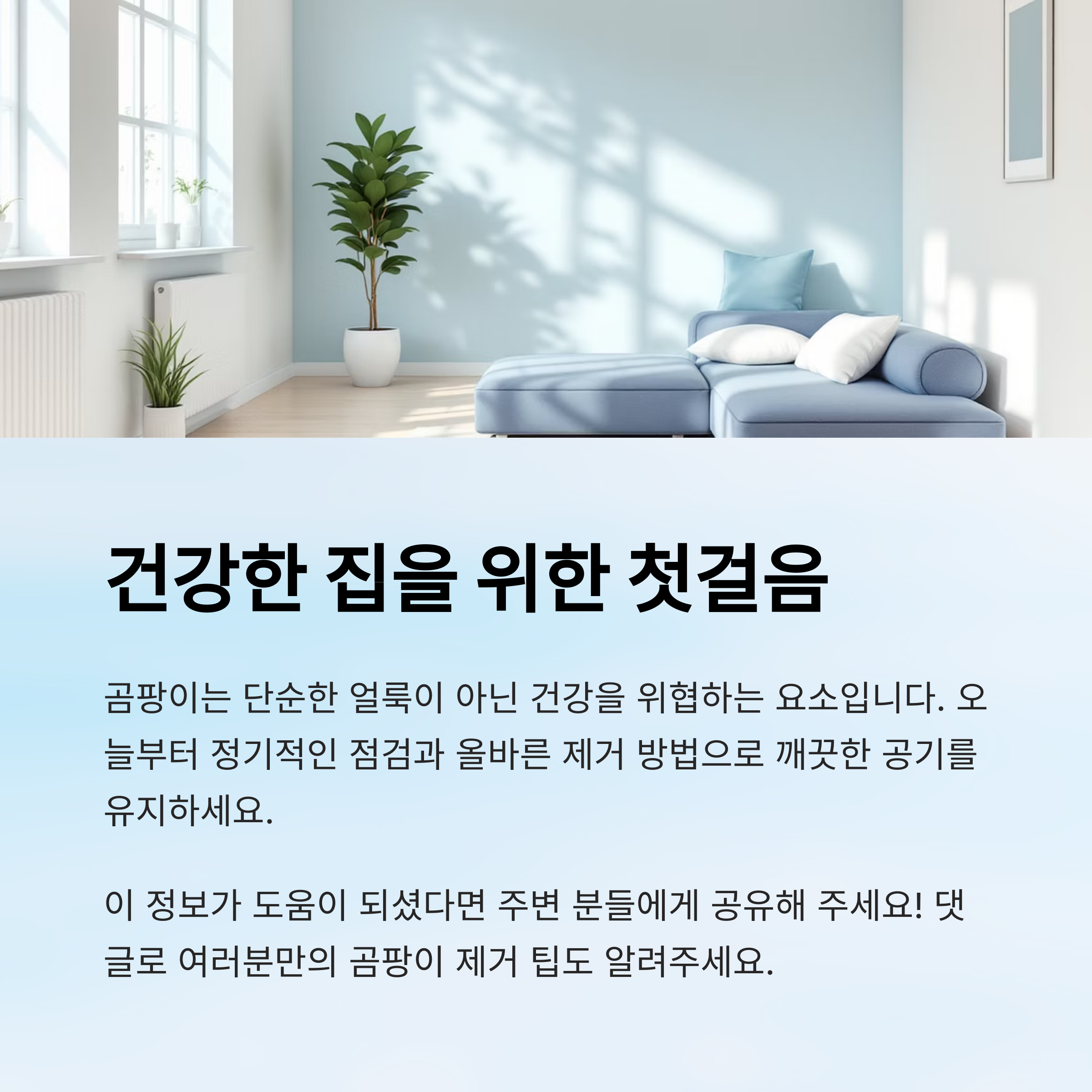 곰팡이는 단지 보기 안 좋은 얼룩이 아니에요. 우리 몸에 직접적인 영향을 미치는 위험 요소라는 걸 잊지 말고, 발견 즉시 정리하고 환기와 청소를 철저히 해보세요. 🛡️