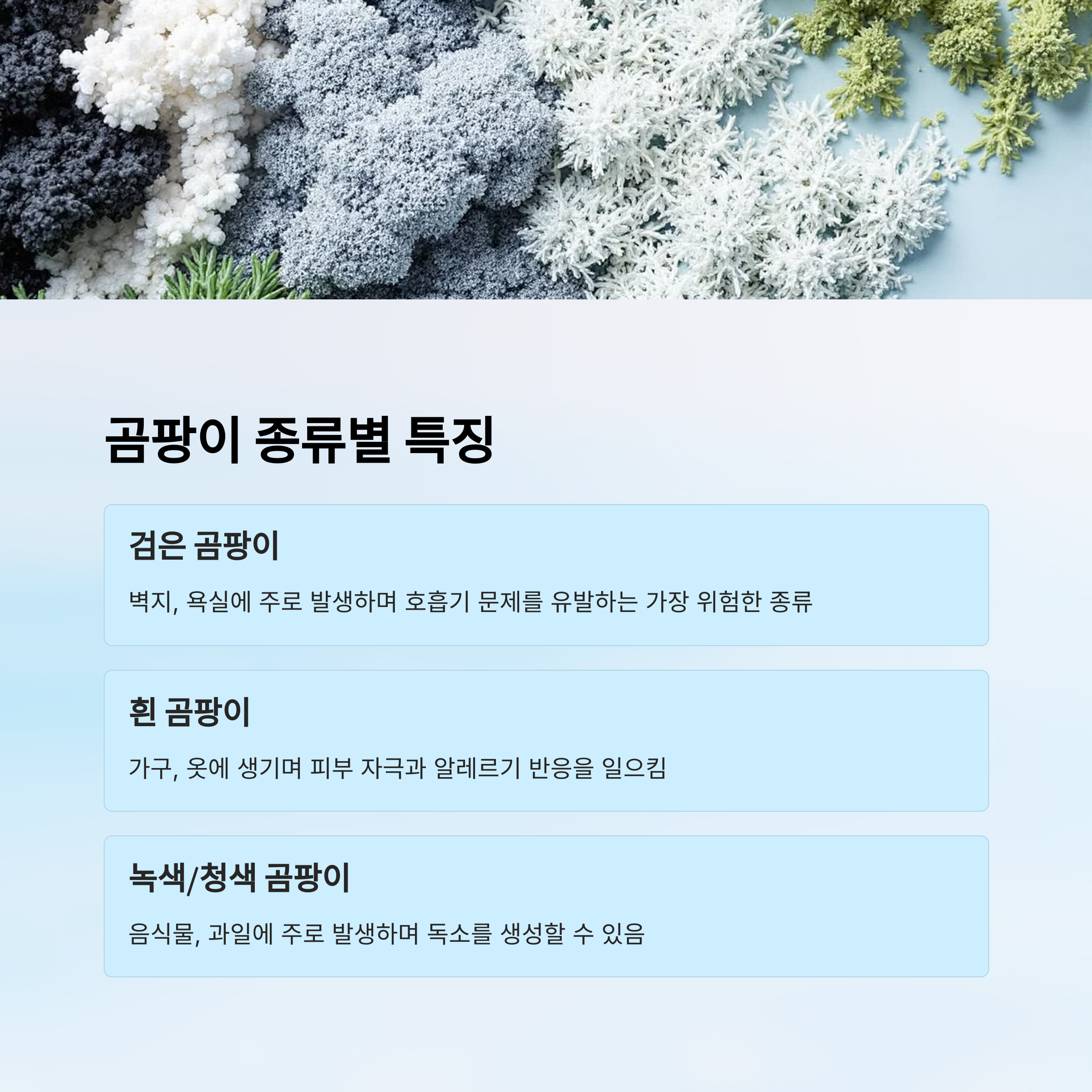 곰팡이는 종류에 따라 색과 생김새가 달라요. 검은 곰팡이는 '스택키보트리스'라고 불리며, 건강에 가장 치명적인 종류 중 하나예요. 흰색 곰팡이는 보통 옷이나 가죽 제품에 자주 생기고, 녹색이나 파란색 곰팡이는 음식물에 흔하죠.