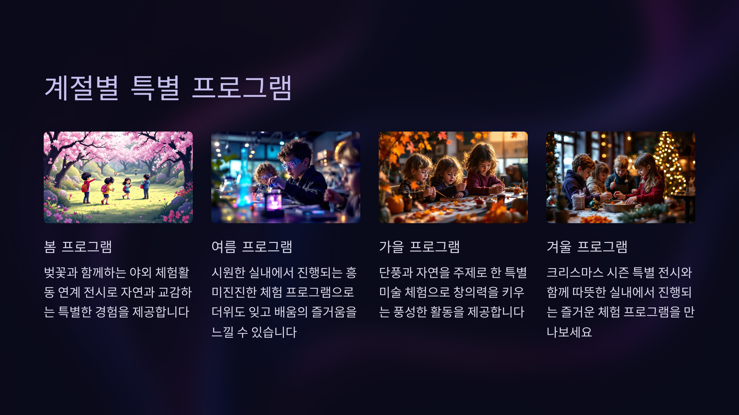 가을에는 자연을 주제로 한 활동들이 많아요. 예를 들어, 낙엽을 활용한 미술 체험이나 가을 수확물을 이용한 요리 워크숍이 열리기도 해요. 겨울에는 실내에서 진행되는 크리스마스 관련 프로그램이나 따뜻한 분위기의 체험 활동들이 준비되어 있어요.