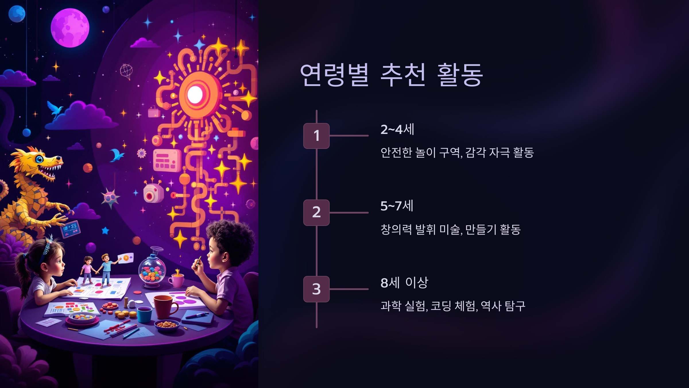 8세 이상의 아이들은 과학 실험, 코딩 체험, 역사 탐구 등 조금 더 복잡한 활동에 흥미를 보일 가능성이 커요. 아이의 관심사를 파악하고, 맞춤형 활동을 선택해 주는 것이 중요해요.