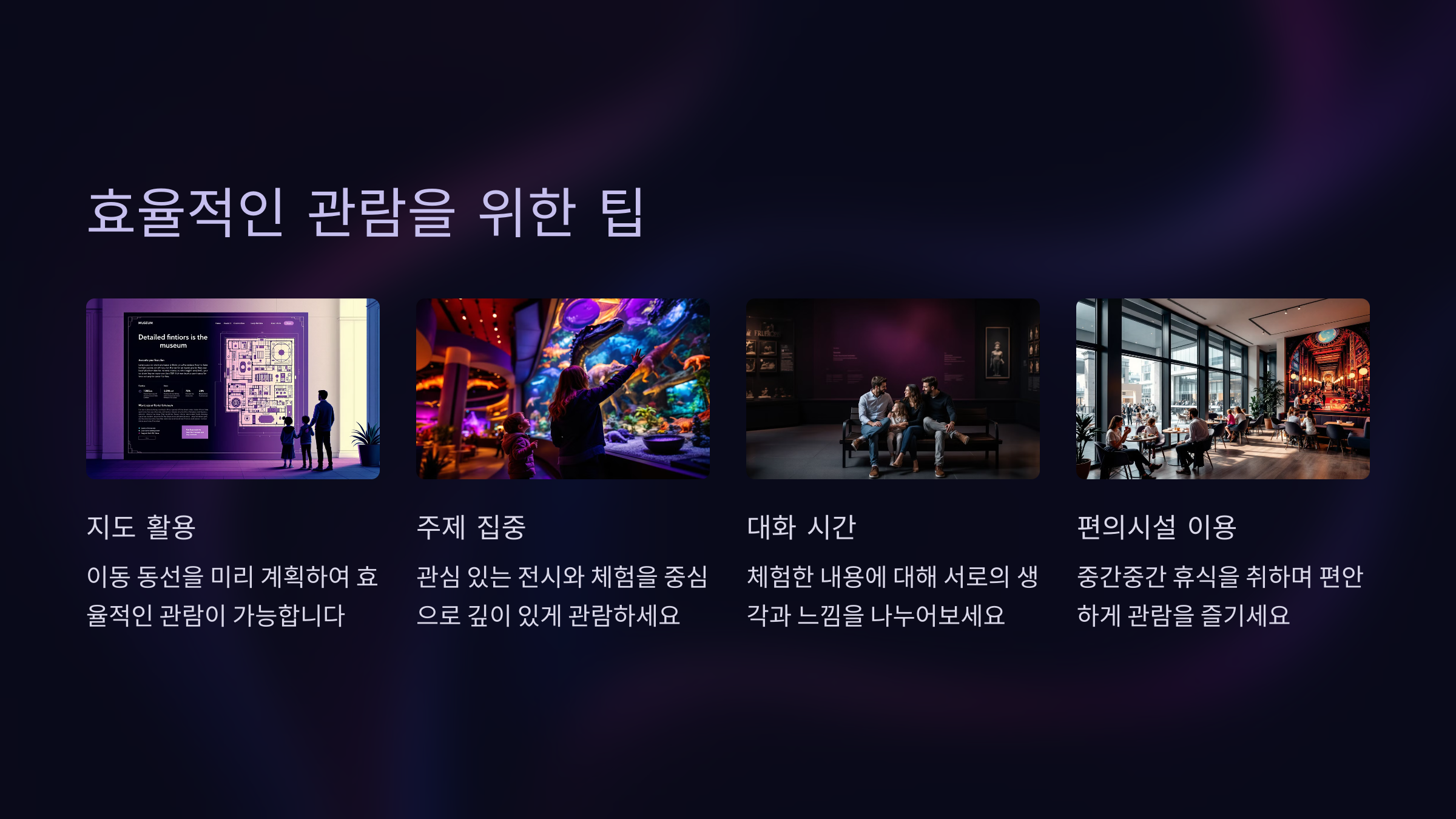 마지막으로, 박물관 내 편의시설을 잘 활용하세요. 카페테리아, 수유실, 유아 휴게실 같은 공간을 이용해 아이들과 함께 편안한 시간을 보내는 것도 중요해요.