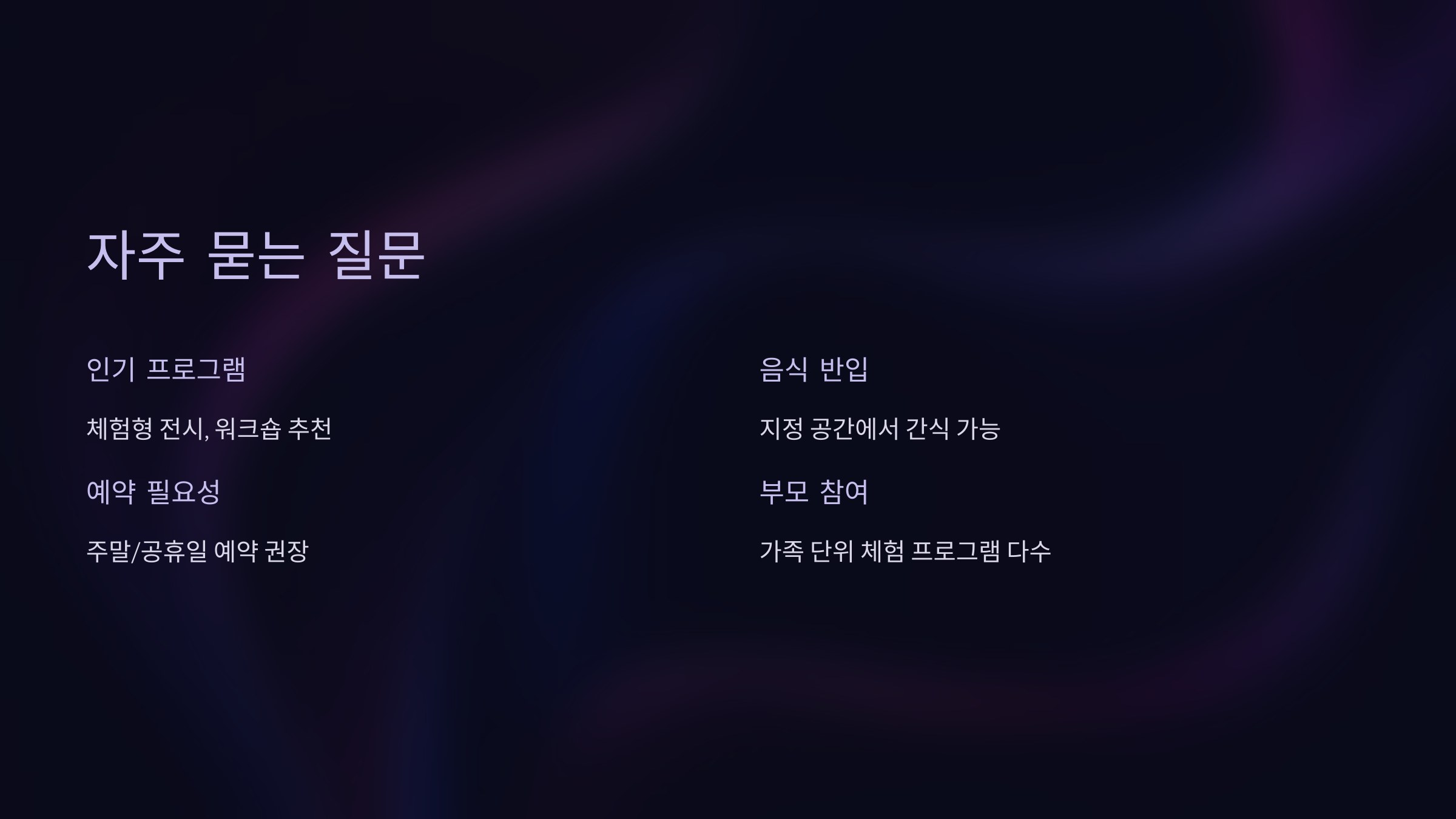 A2. 일부 프로그램은 사전 예약이 필수지만, 대부분의 일반 전시는 예약 없이도 관람 가능해요. 하지만 주말이나 공휴일에는 혼잡할 수 있으니 예약을 권장해요.