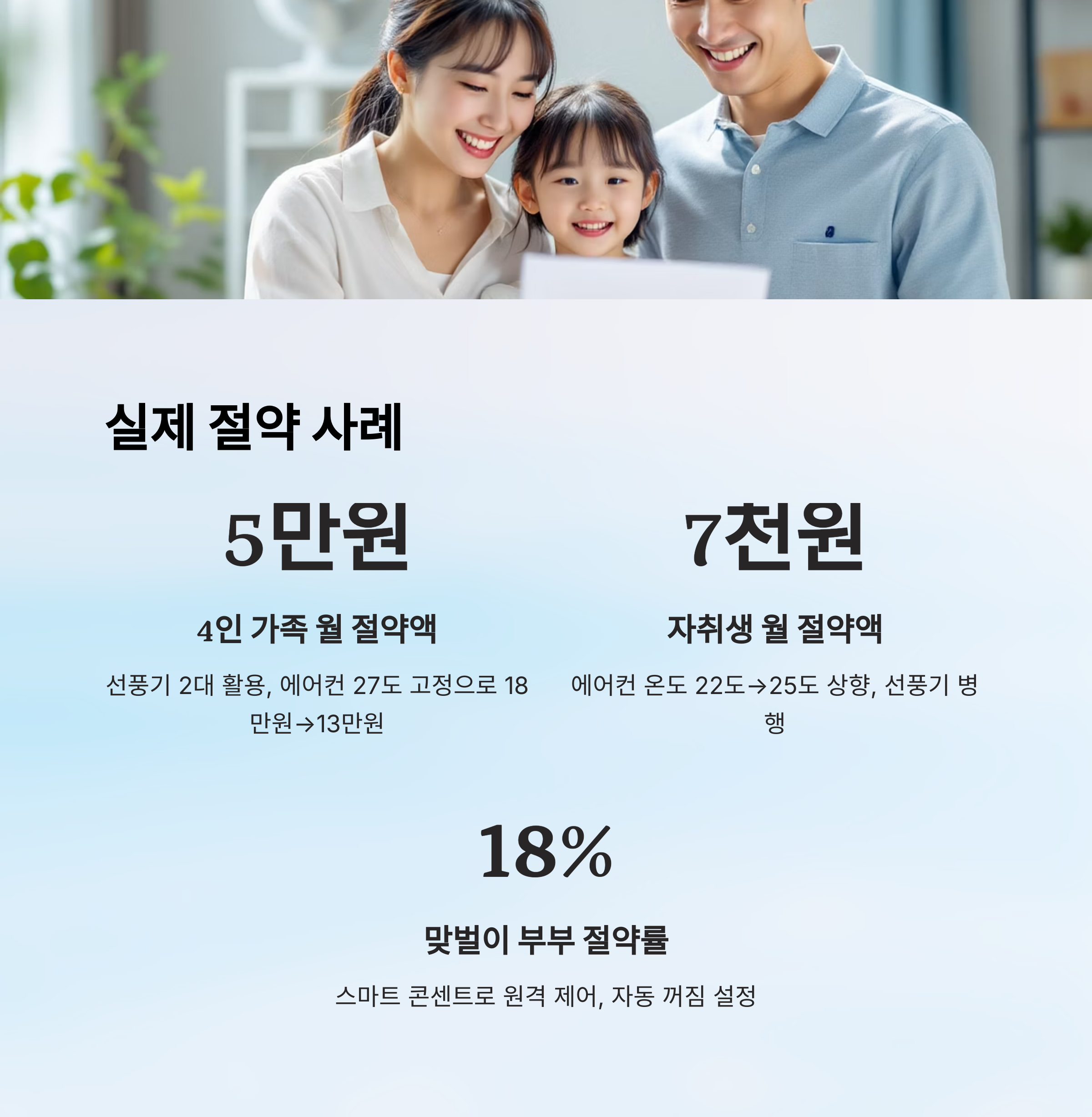 | B씨 (1인 가구) | 설정온도+선풍기 | 월 7천 원 절약 | 간편 실천 |