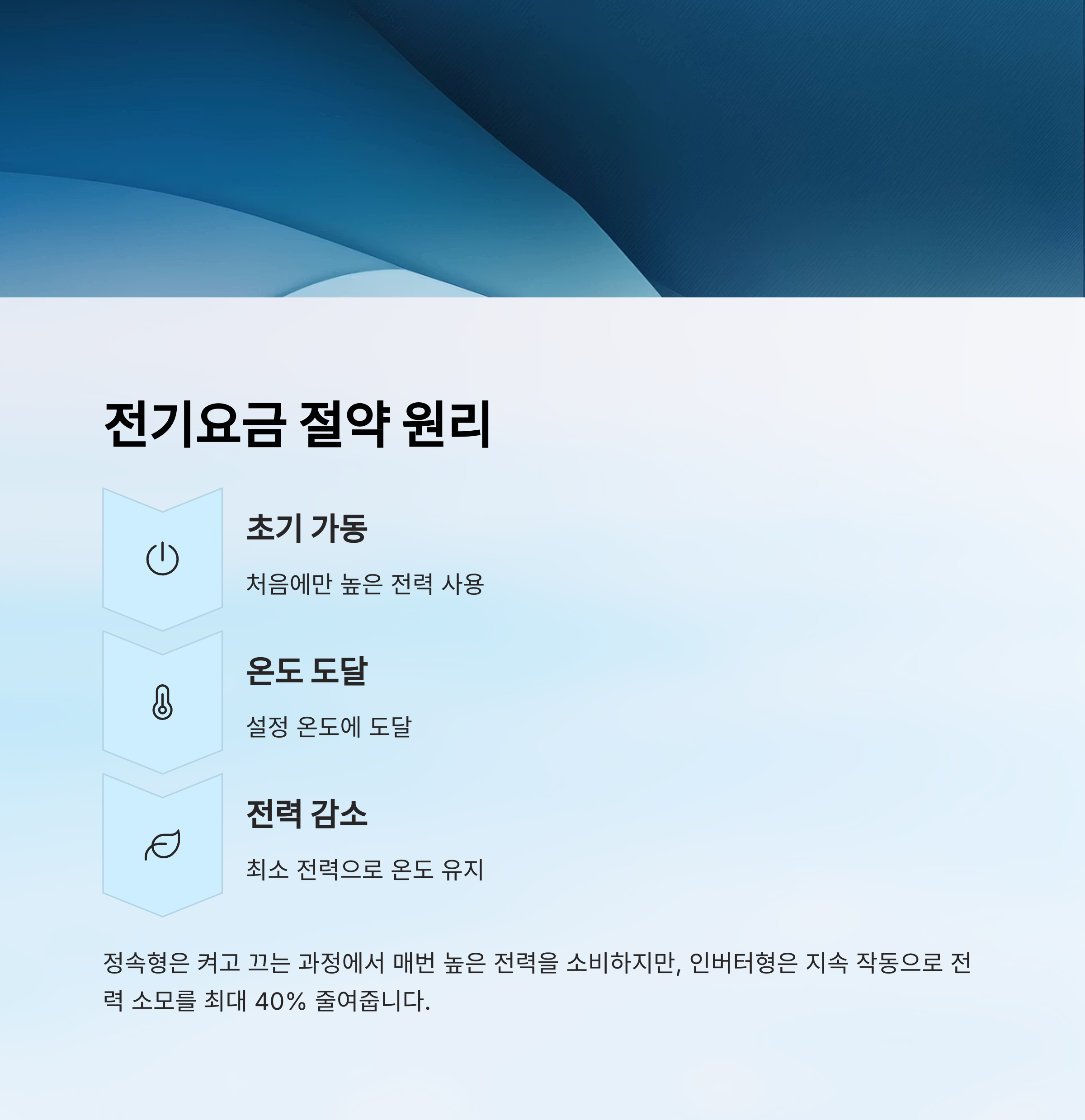 이와 달리 정속형은 꺼졌다가 다시 켜질 때마다 높은 전력을 다시 소비하게 돼요. 이 켜짐과 꺼짐이 반복될수록 전기요금이 더 많이 올라가게 되는 거죠.