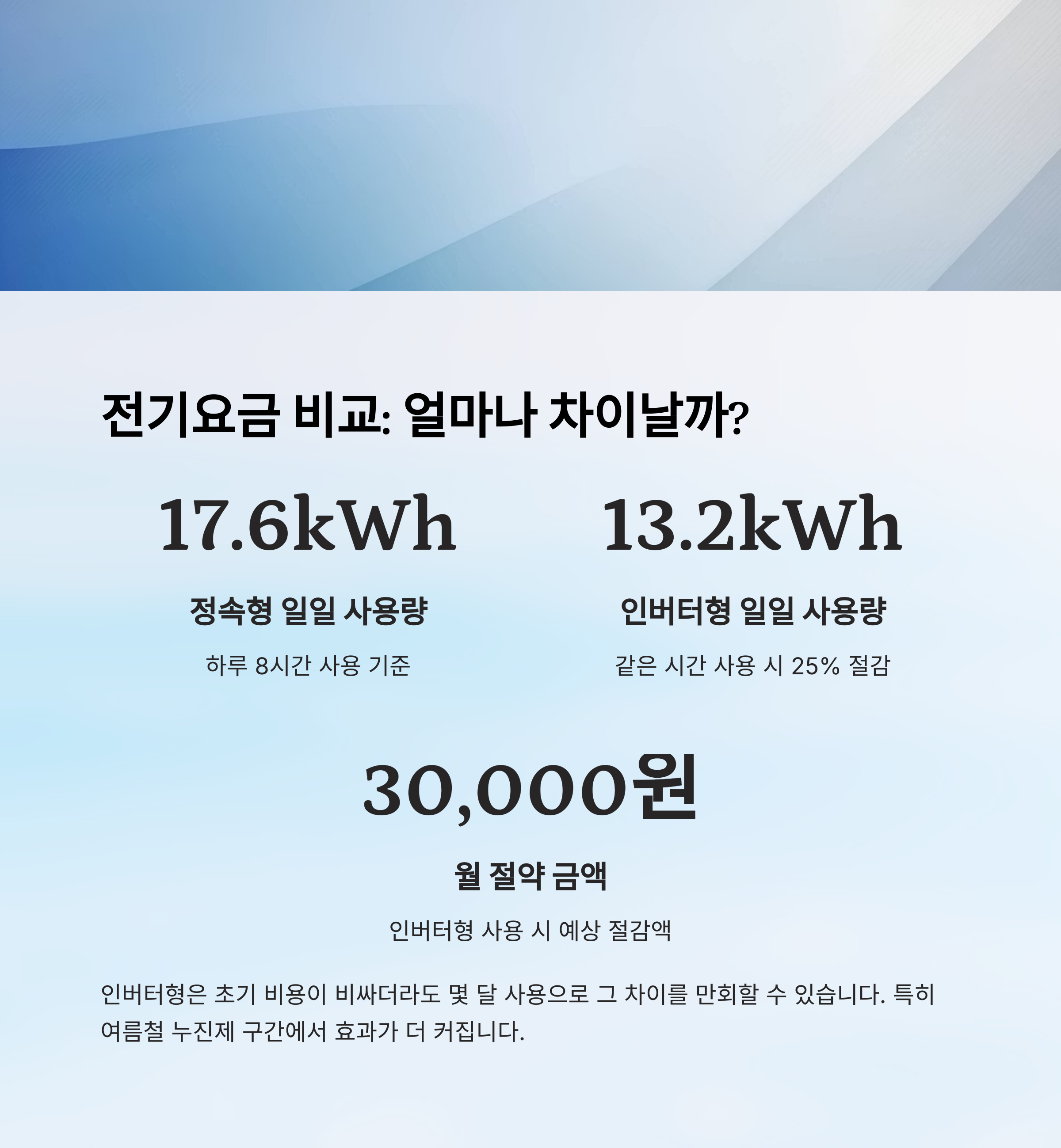 그렇다면 정속형과 인버터형을 각각 실제로 하루 8시간씩 30일 동안 사용한다고 가정했을 때, 전기요금에는 얼마나 차이가 있을까요? 아래 표를 보면 예상보다 꽤 큰 차이가 있다는 걸 확인할 수 있어요.