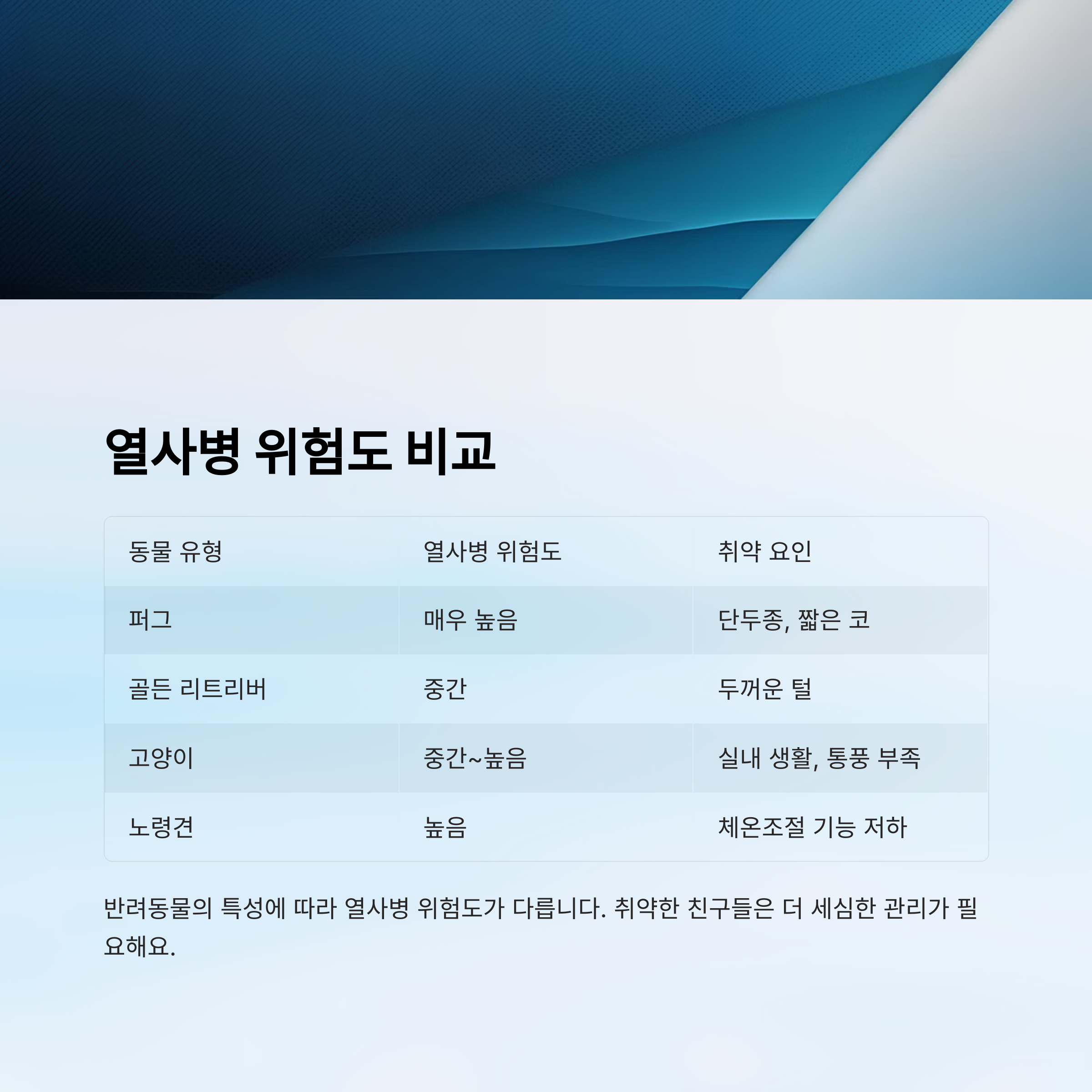 위 표를 보면 어떤 반려동물이 열사병에 더 취약한지 쉽게 알 수 있어요. 특히 퍼그나 노령견처럼 호흡기계나 체온조절에 취약한 친구들은 한여름 관리에 신경을 더 써야 해요.