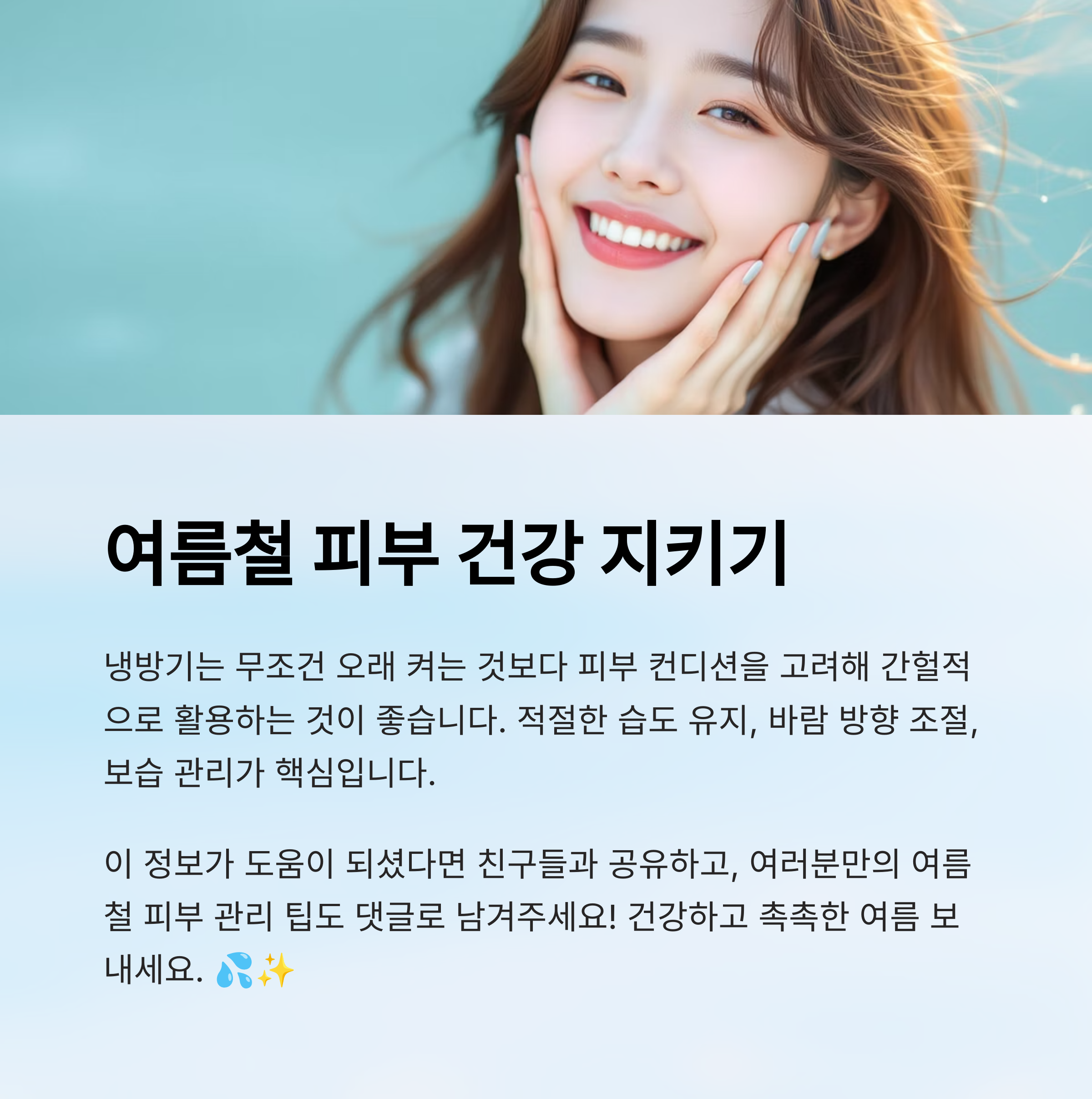 제가 생각했을 때 여름철 냉방기 사용은 단순한 생활 편의가 아니라 피부 건강을 지키는 기술이에요. 무심코 사용하는 냉방기가 피부를 예민하게 만들 수 있으니, 똑똑하게 사용하는 습관이 정말 중요해요.