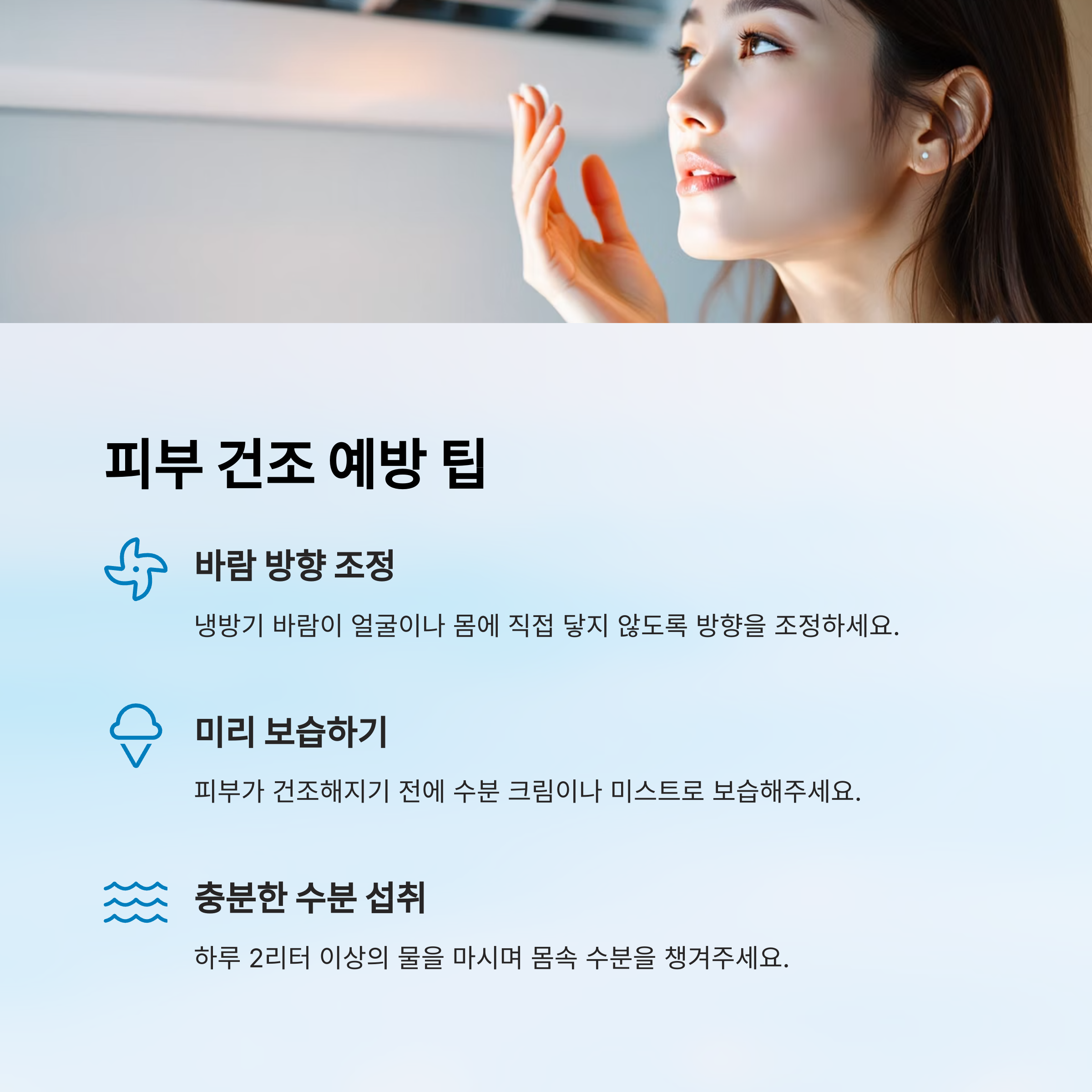 이런 습관을 잘 지켜주면 냉방기 아래서도 건강한 피부를 유지할 수 있어요. 특히 여름철에는 외부 자극도 많기 때문에 기본적인 보습과 수분 유지가 피부를 지키는 핵심이랍니다. 💦