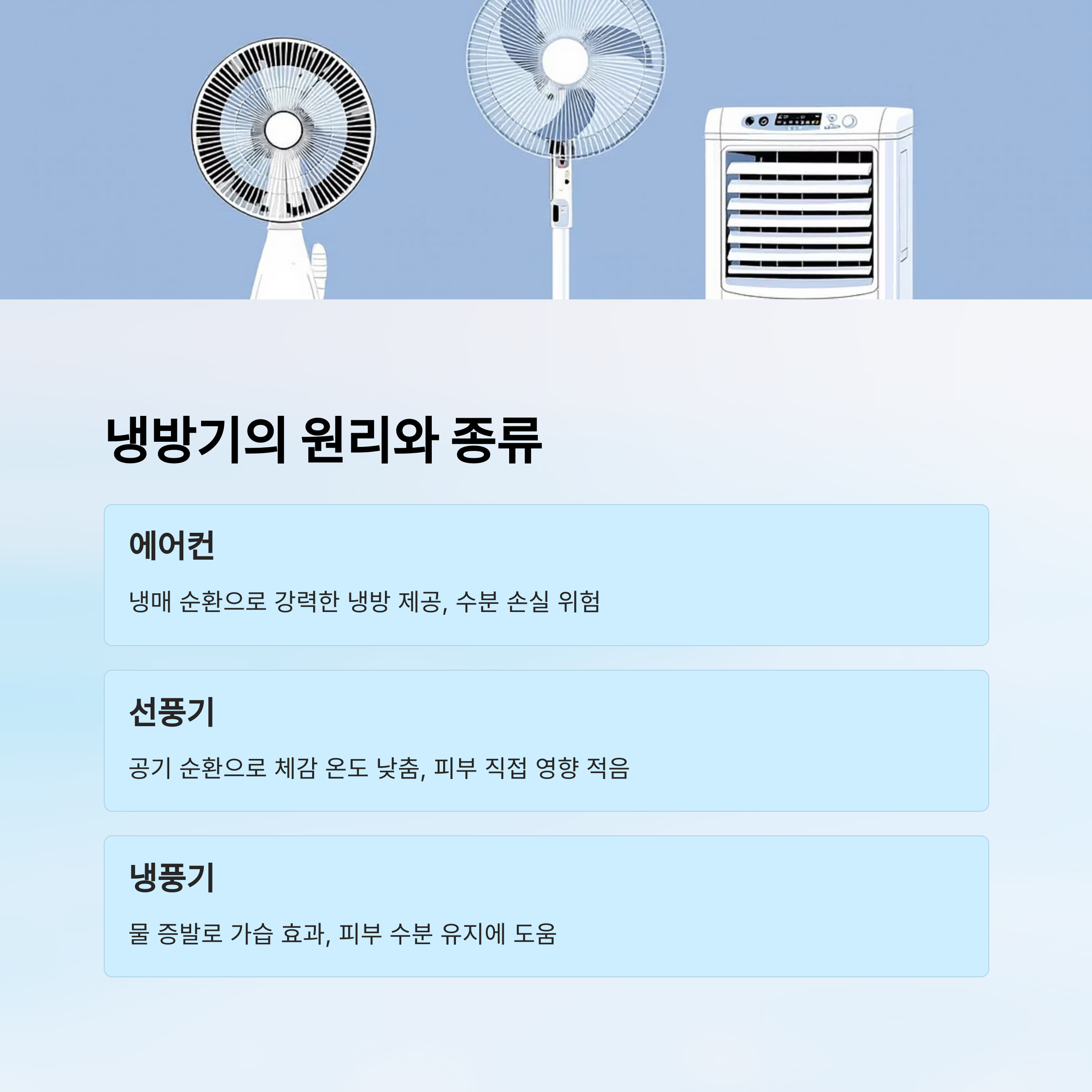 | 종류 | 냉방 방식 | 특징 | 피부 영향 |