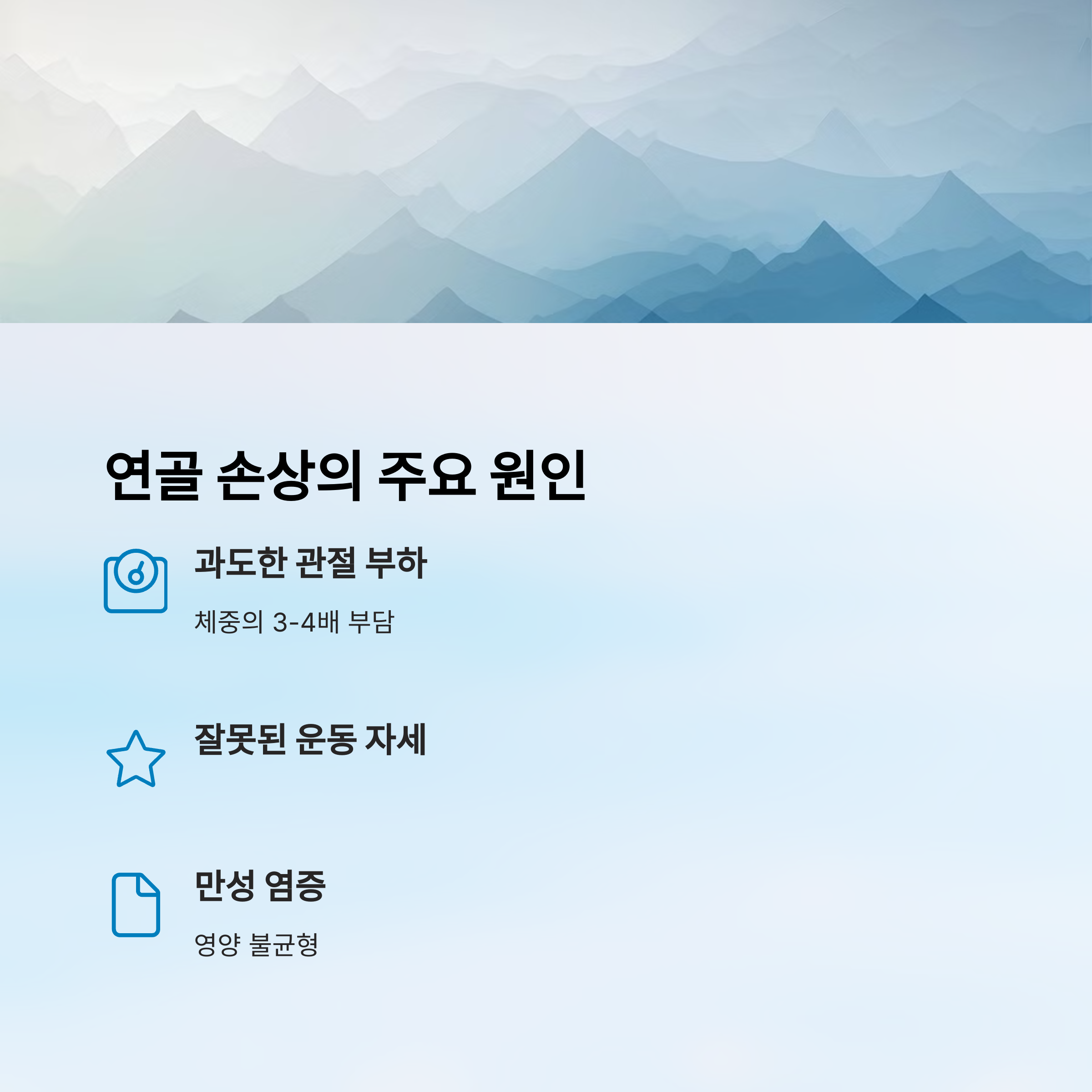 문제는 연골에는 혈관이 없기 때문에, 한 번 손상되면 자연적으로 회복되기 어렵다는 점이에요. 그래서 더 조심해야 해요.