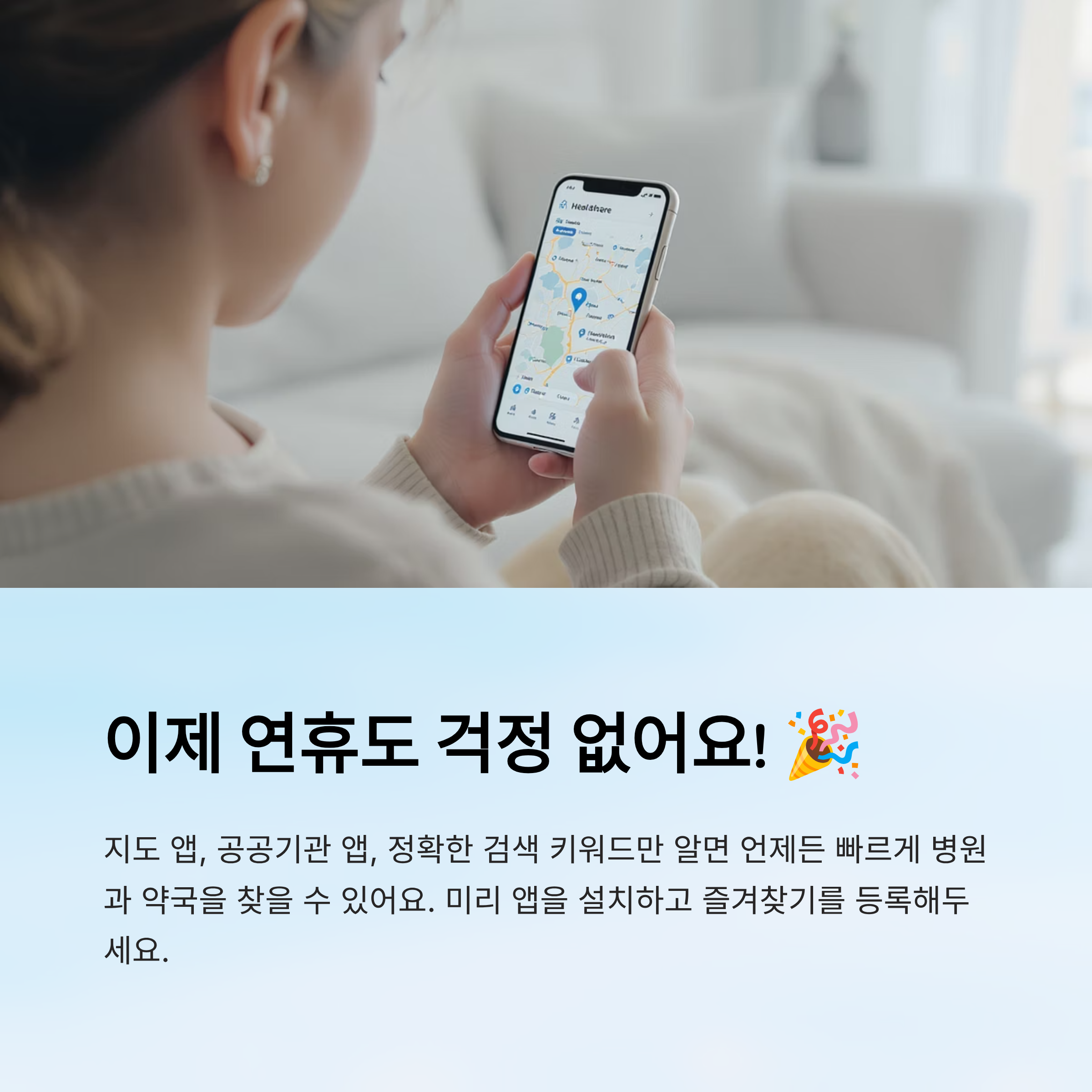 이제부터는 “연휴에 병원 어떻게 찾지?” 고민할 필요 없어요. 이 팁들만 기억해두면 누구보다 빠르게, 남들과는 다르게 약국과 병원을 찾을 수 있어요! ⏱