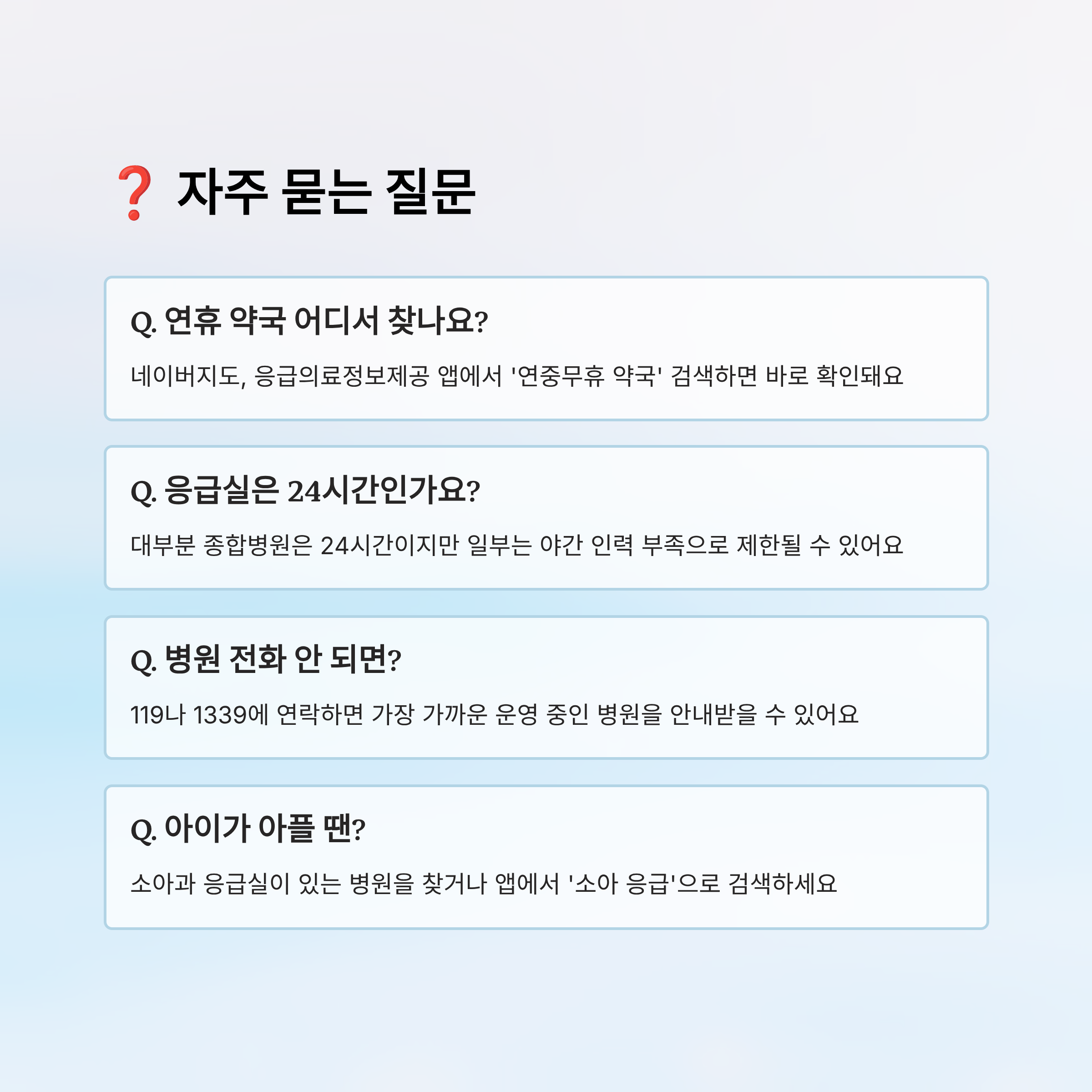 연휴엔 모두가 이동하고 병원은 줄어드는 구조이기 때문에, 빠르게 상황을 판단하고 대응 순서를 아는 게 정말 중요해요. 검색, 전화, 앱, 신고를 상황에 맞게 조합하면 어떤 위급 상황도 충분히 잘 넘길 수 있어요 💪