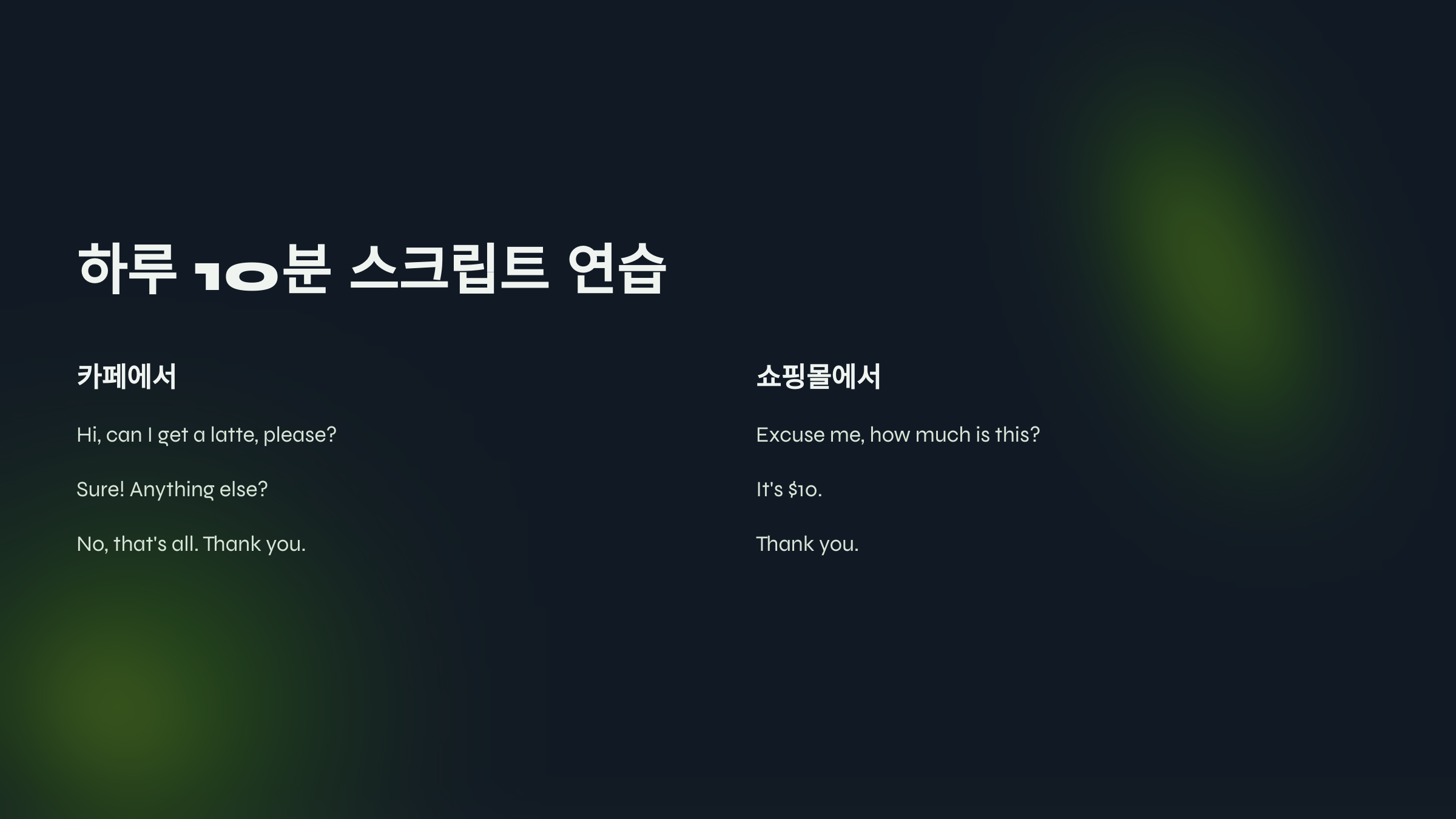 이런 스크립트를 반복적으로 읽고 말해보세요. 상황별로 다양한 표현을 익히는 데 큰 도움이 됩니다. 💬