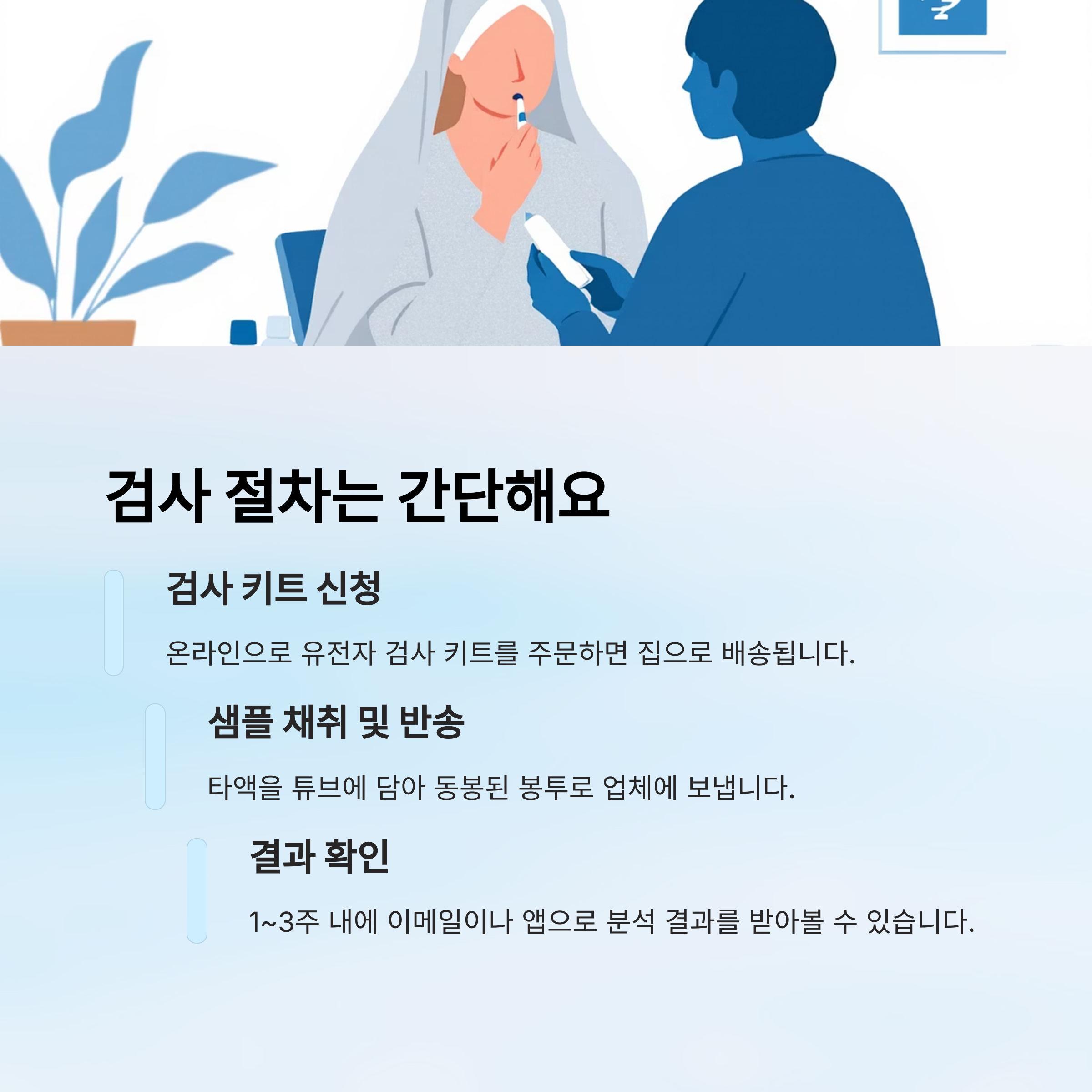 유전자 검사는 생각보다 간단해요. 특히 DTC(Direct-to-Consumer) 방식은 비대면으로 집에서도 검사할 수 있어서 편리하답니다. 보통 아래와 같은 절차로 진행돼요.