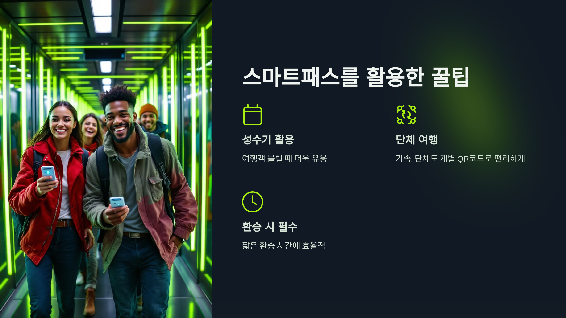 가족 단위나 단체 여행의 경우에도 각자의 QR코드를 신청하면 보다 편리한 이동이 가능합니다. - 환승 시간 촉박 시 필수 아이템