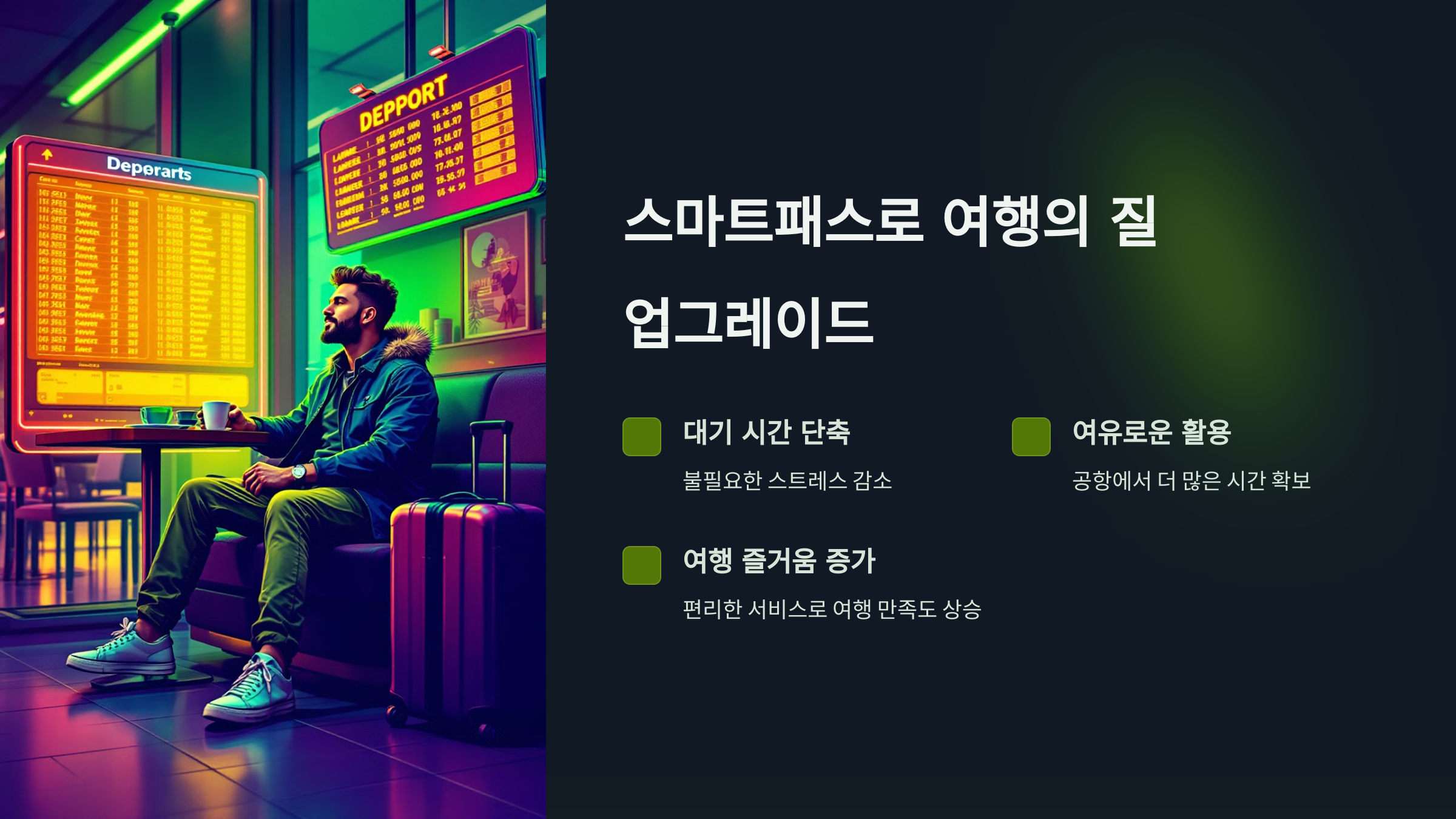 공항에서의 시간은 매우 중요합니다. 특히 출발 직전, 보안 검색을 기다리는 동안 마음이 급해지기 마련이죠. 스마트패스를 이용하면 일반 통로에서 발생하는 긴 대기줄을 피할 수 있어 여유를 되찾을 수 있습니다.