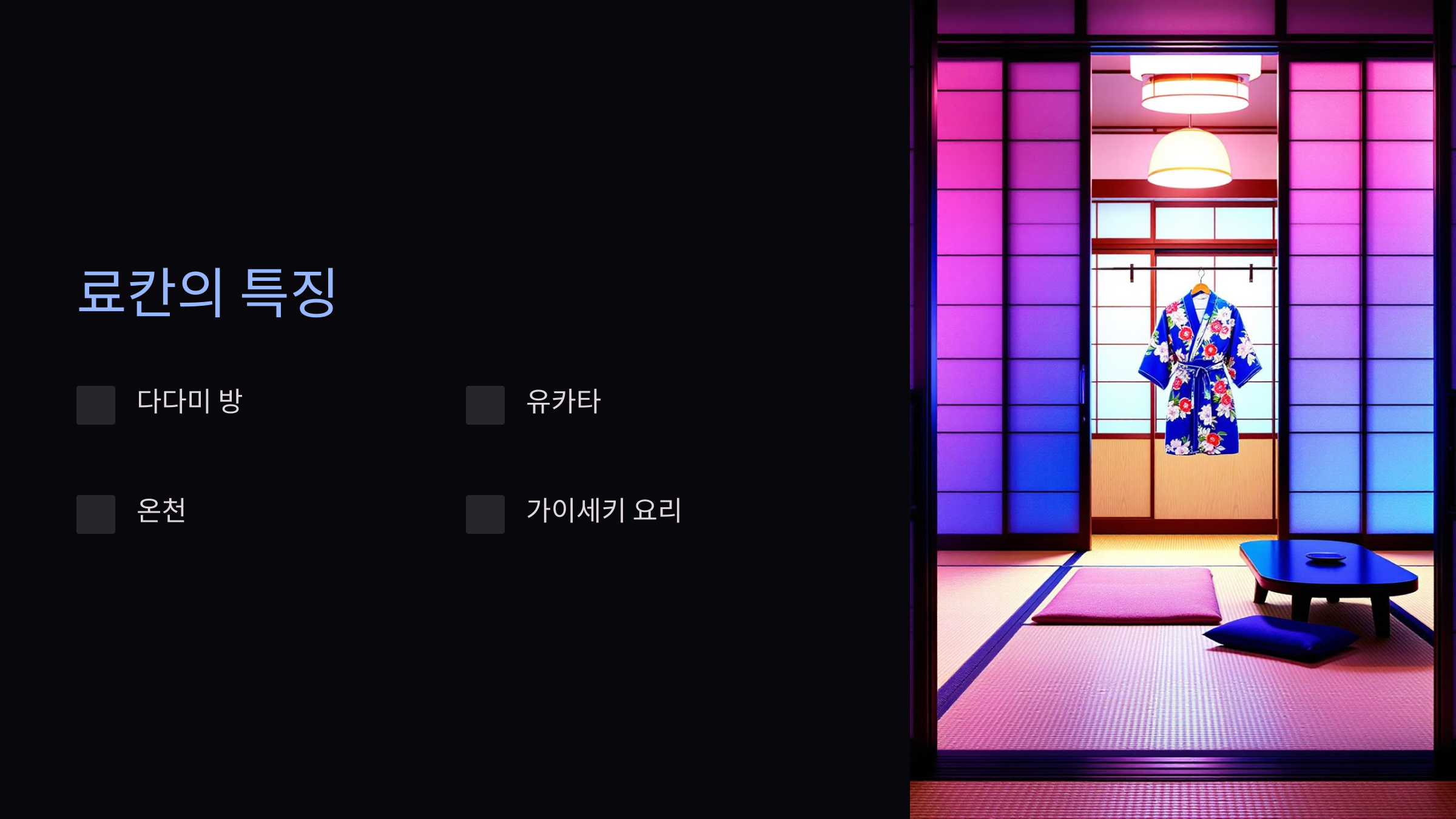 2. **전통 문화 체험**: 다다미 방, 유카타 착용, 가이세키 요리 등 일본 전통 문화를 직접 체험할 수 있습니다.