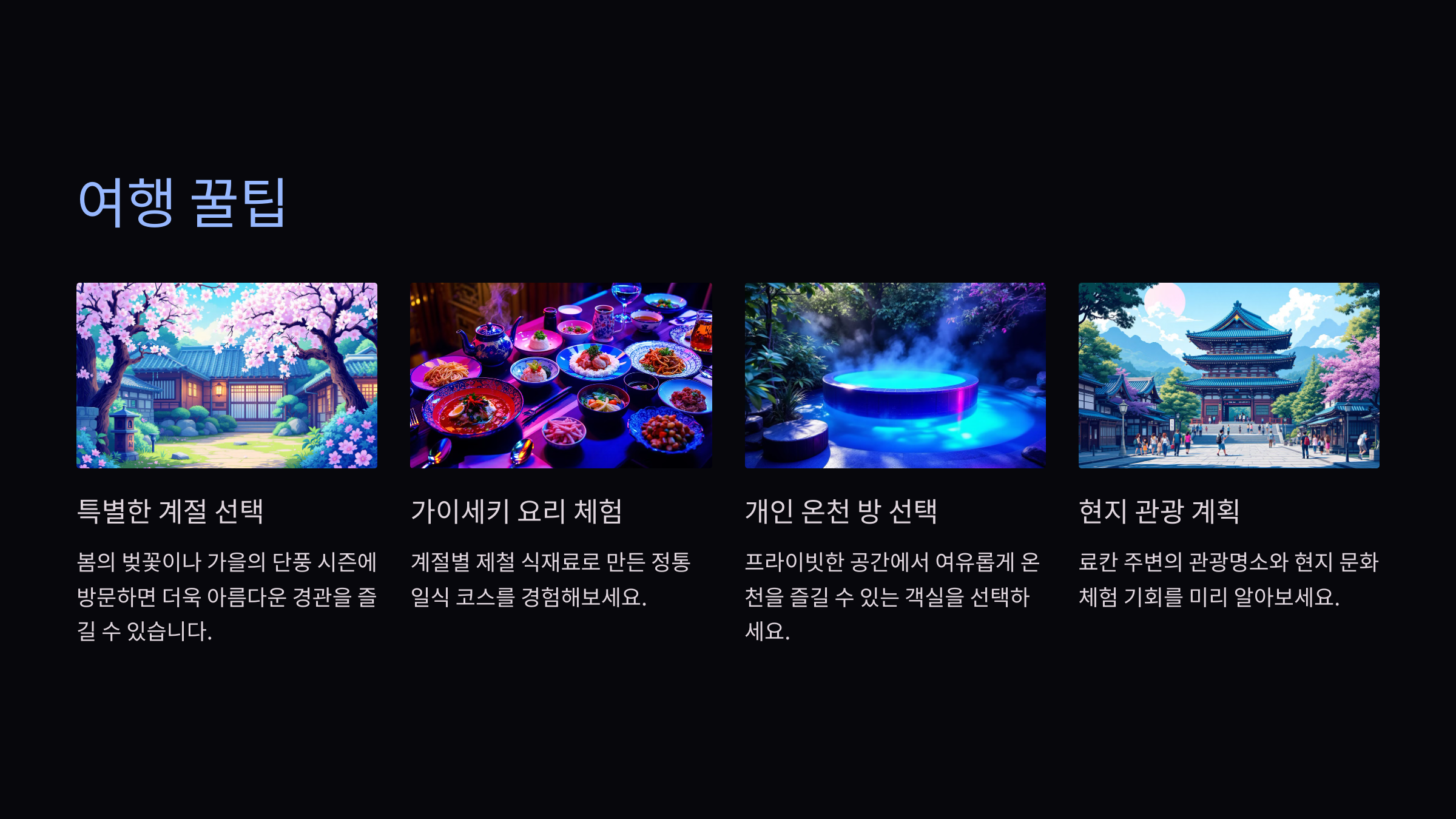 6. **료칸 스태프와의 소통**: 간단한 일본어 인사말을 준비하면 더 따뜻한 환대를 받을 수 있습니다.