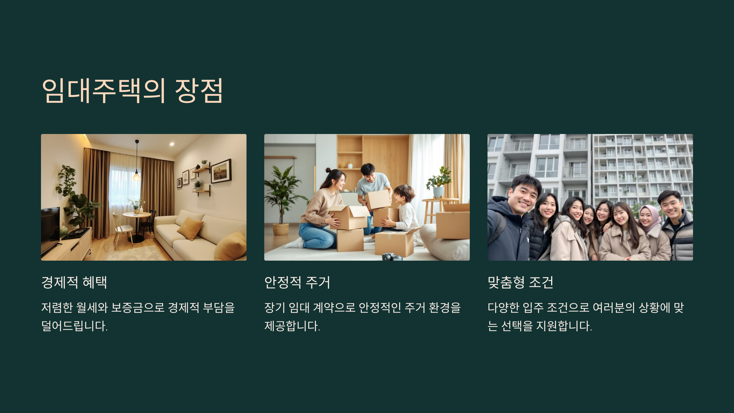 4. 다양한 입주 조건: 청년, 신혼부부, 고령자 등 맞춤형 조건.