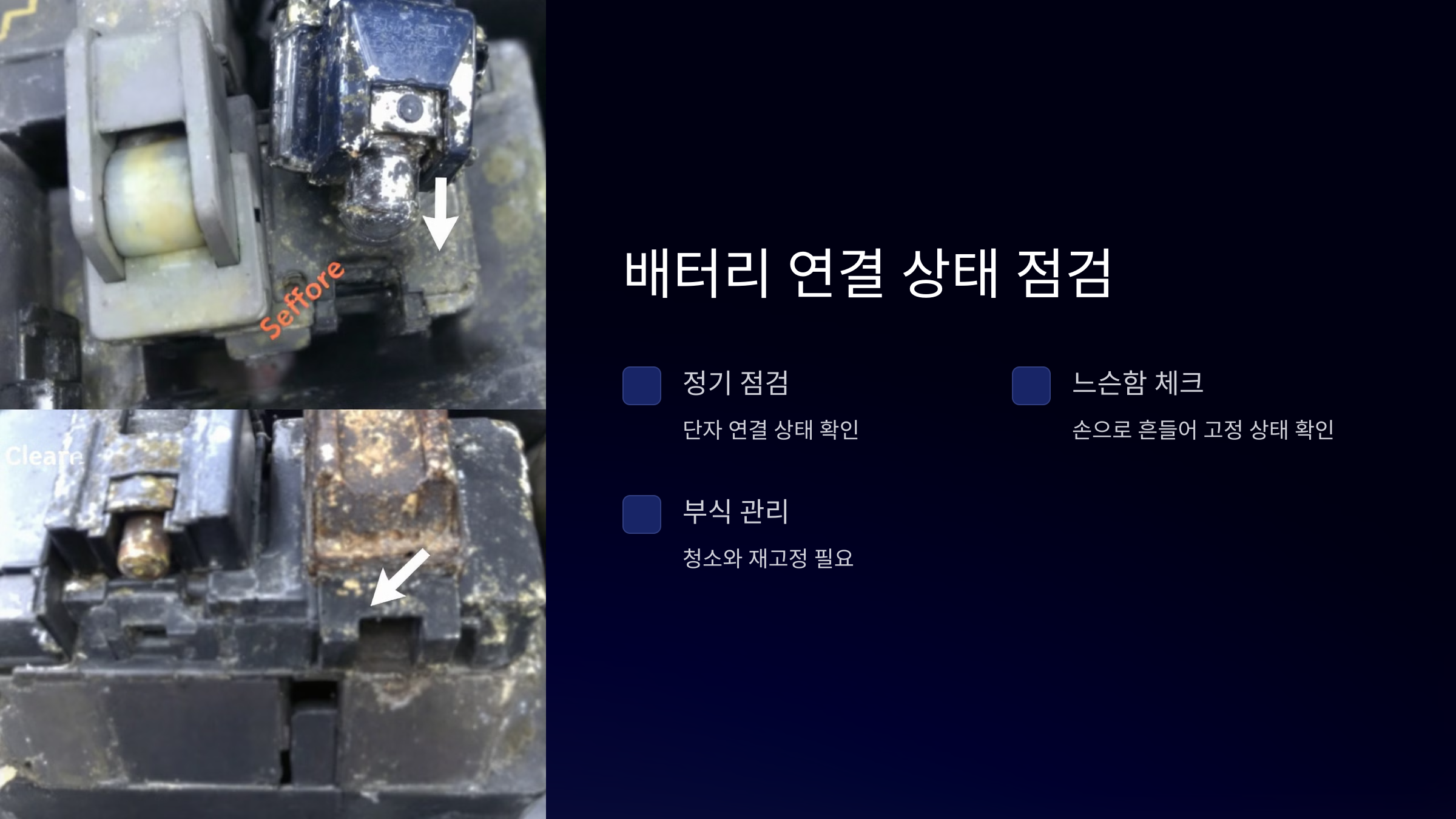정기적인 단자 청소는 배터리의 효율과 수명을 높이는 중요한 과정입니다.