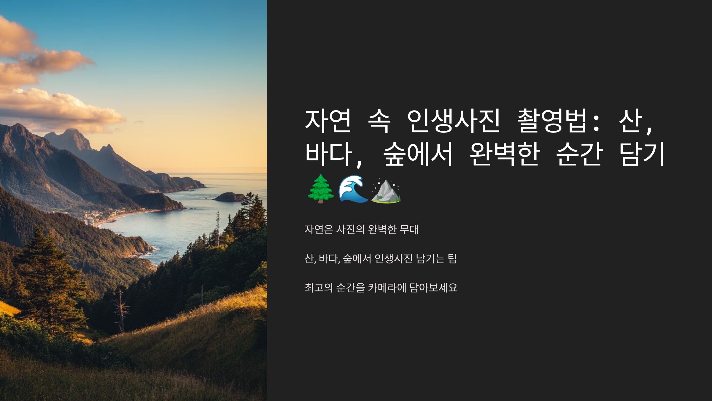 자연은 사진을 찍기에 완벽한 무대입니다. 그러나 자연의 웅장함과 아름다움을 사진 속에 제대로 담기란 쉽지 않죠. 🌿 오늘은 산, 바다, 숲 등 자연 속에서 인생사진을 남길 수 있는 촬영법과 연출 팁을 알려드리겠습니다. 이 글을 읽고 나면 여러분의 카메라 속에는 최고의 순간들이 가득할 거예요! 📸