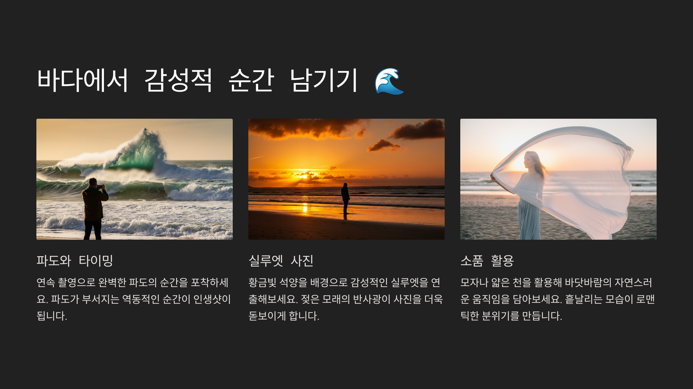 - 파도와의 타이밍: 파도가 치는 순간을 연속 촬영 모드로 담아보세요.
