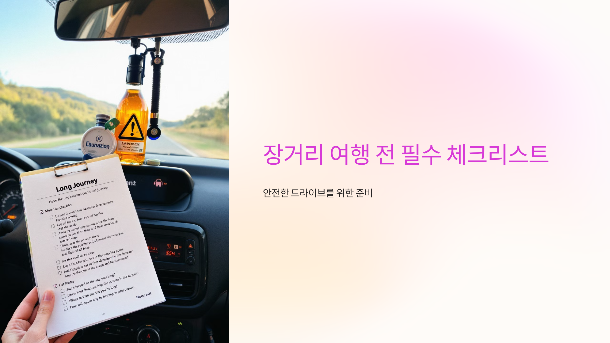 장거리 여행을 떠나기 전 차량 점검과 준비를 철저히 하는 것은 안전하고 편안한 드라이브를 위한 필수 조건입니다. 차량 상태 점검부터 비상 키트 준비까지, 아래의 체크리스트를 통해 여행 준비를 완벽히 마무리하세요.