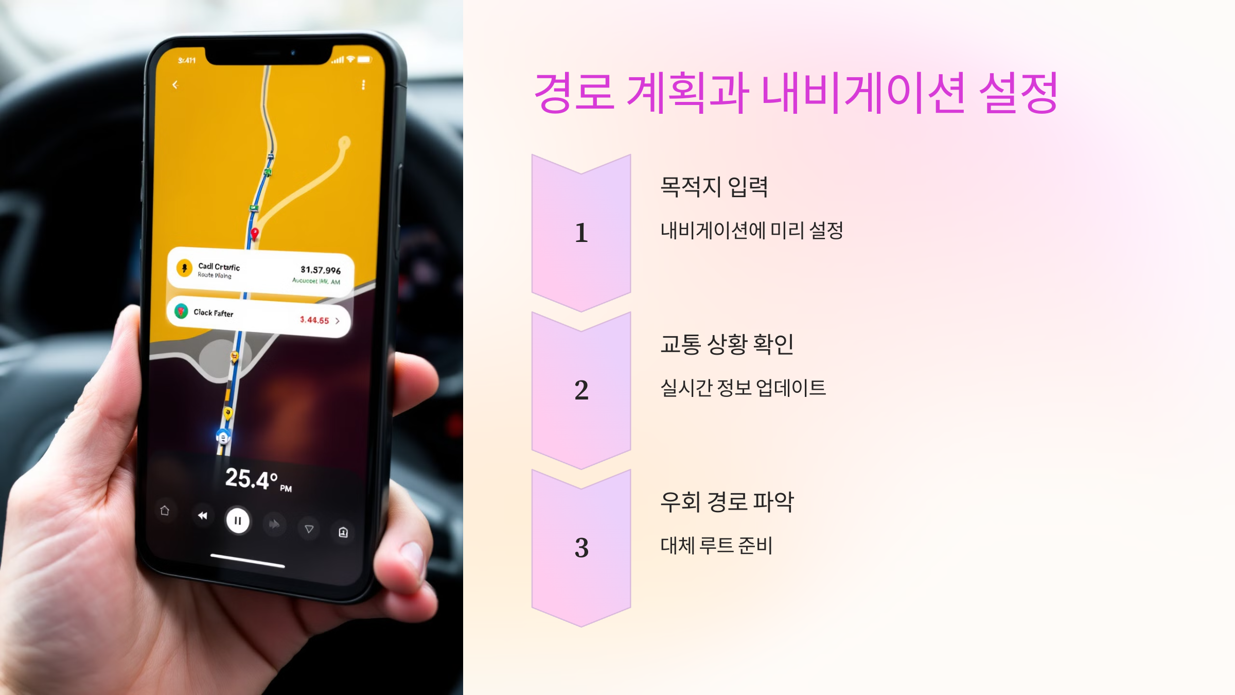 내비게이션을 활용해 최단 경로와 휴게소 위치를 확인하고 우회 경로를 사전에 계획하세요.