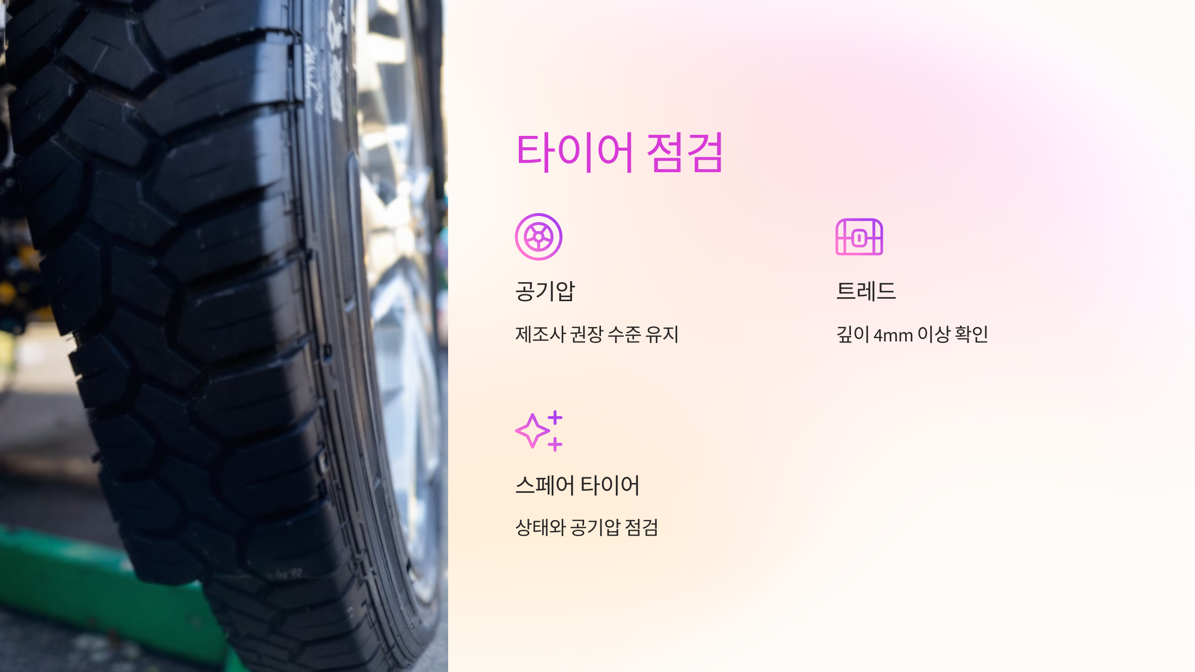스페어 타이어 상태와 공기압도 반드시 확인하세요.