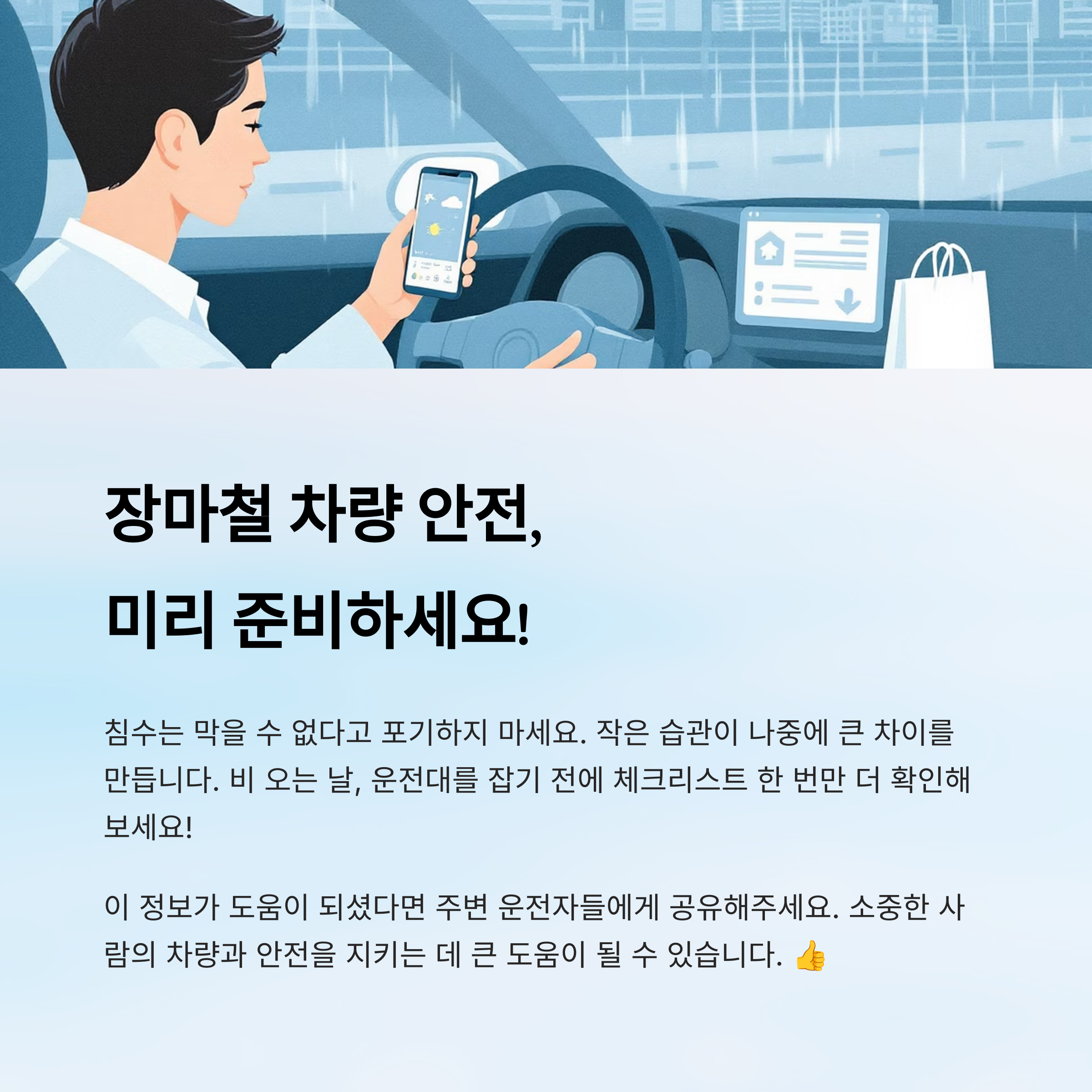 침수는 막을 수 없다고 포기하지 마세요. 작은 습관이 나중에 큰 차이를 만들어요. 비 오는 날, 운전대를 잡기 전에 체크리스트 한 번만 더 확인해보세요!