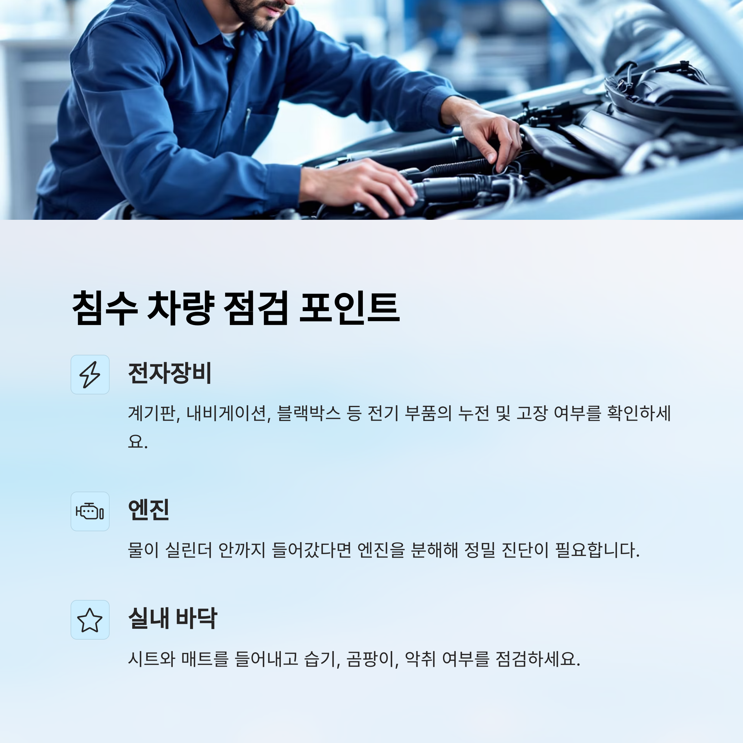 차량이 침수된 후에는 반드시 전문 정비소에서 점검을 받아야 해요. 겉으로 보기엔 멀쩡해 보여도 내부 전기 시스템이나 엔진, 브레이크 등 핵심 부위에 손상이 있을 수 있거든요.