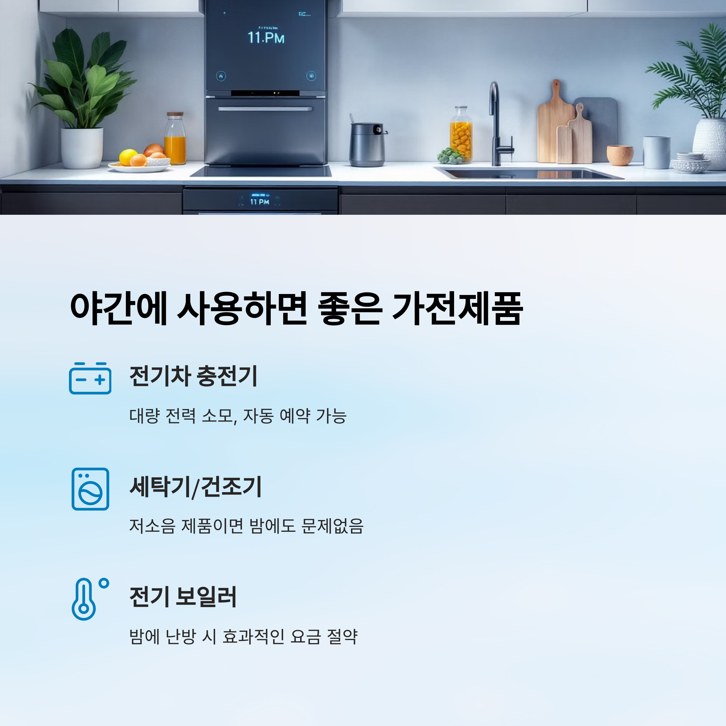 대표적으로는 전기차 충전기, 전기 보일러, 건조기, 식기세척기, 그리고 누진제가 적용되는 냉온수기 등이 있어요. 이런 제품들은 짧은 시간에 많은 전기를 소모하므로 야간 사용이 매우 유리하답니다.