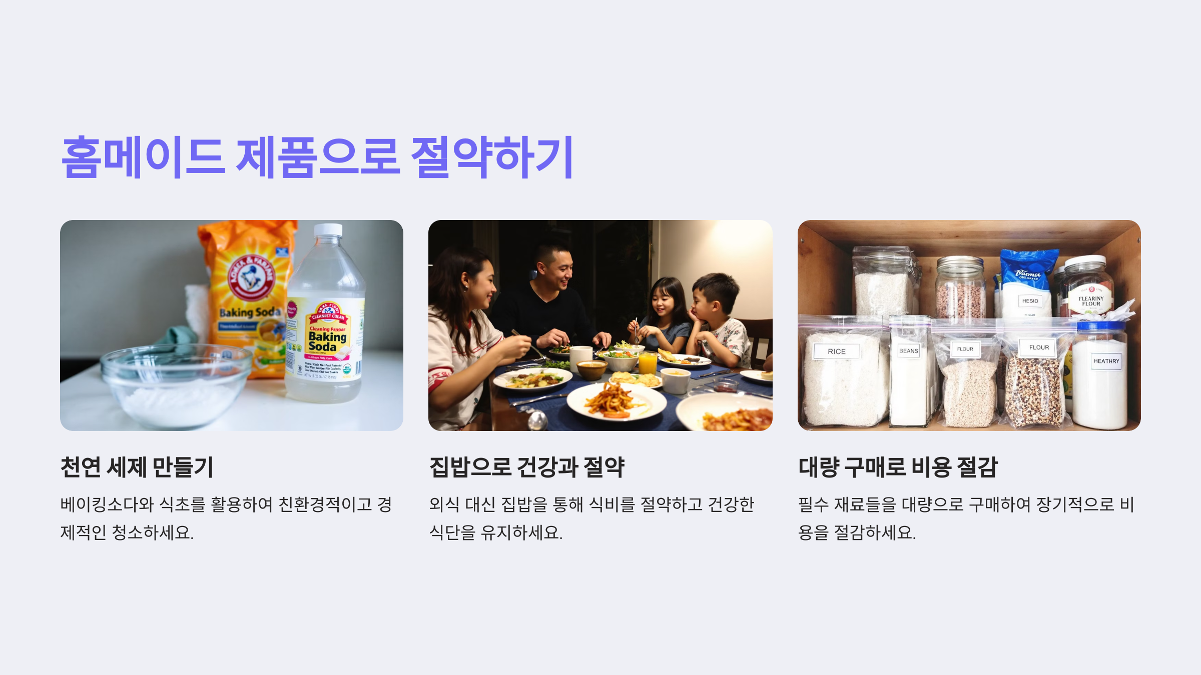 집에서 직접 만들어 사용할 수 있는 제품들로 많은 비용을 절약할 수 있습니다.