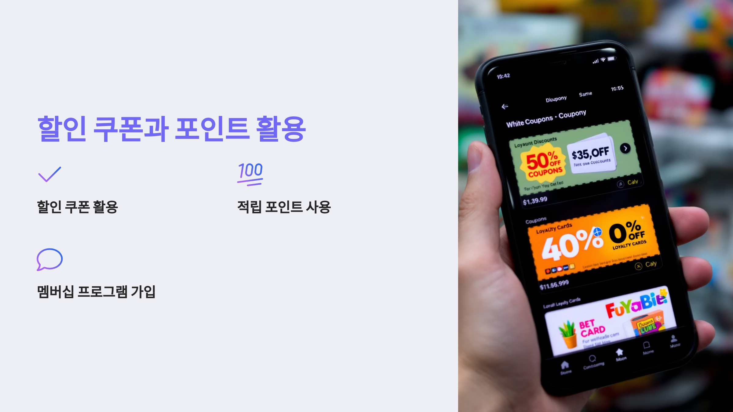 가게나 온라인 쇼핑몰에서 제공하는 할인 쿠폰과 적립 포인트를 적극적으로 활용하세요.