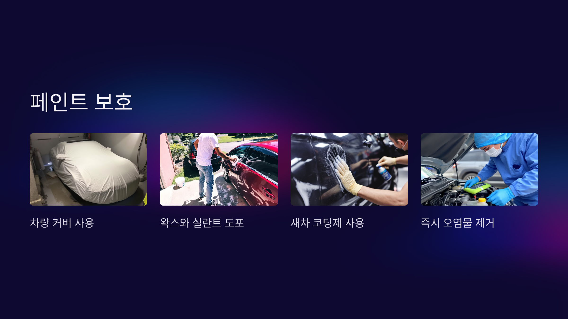 자외선으로 인한 페인트 손상을 막기 위해 차량 커버를 사용하세요.