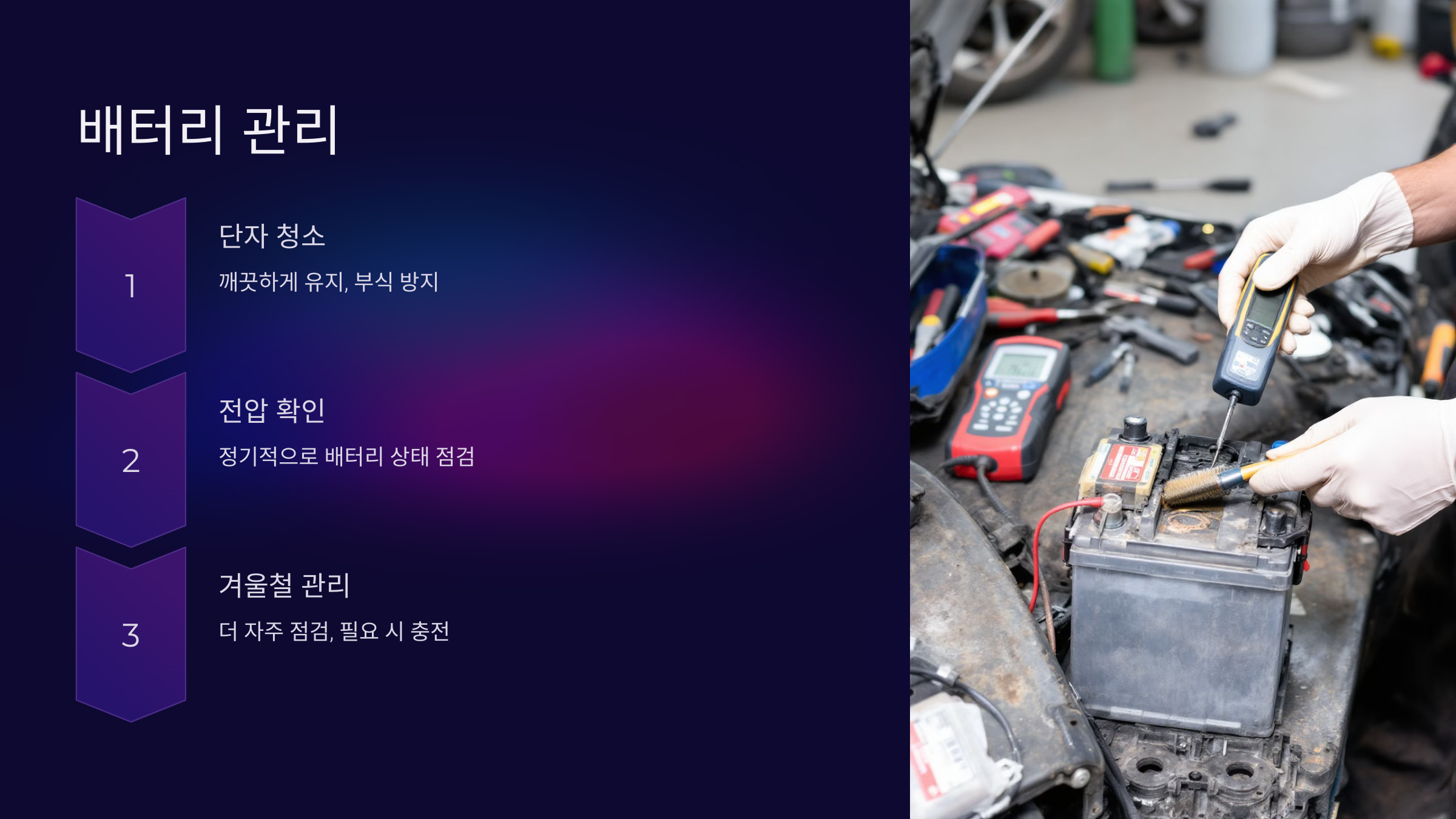 배터리 단자를 깨끗하게 유지하고 부식을 방지하세요.