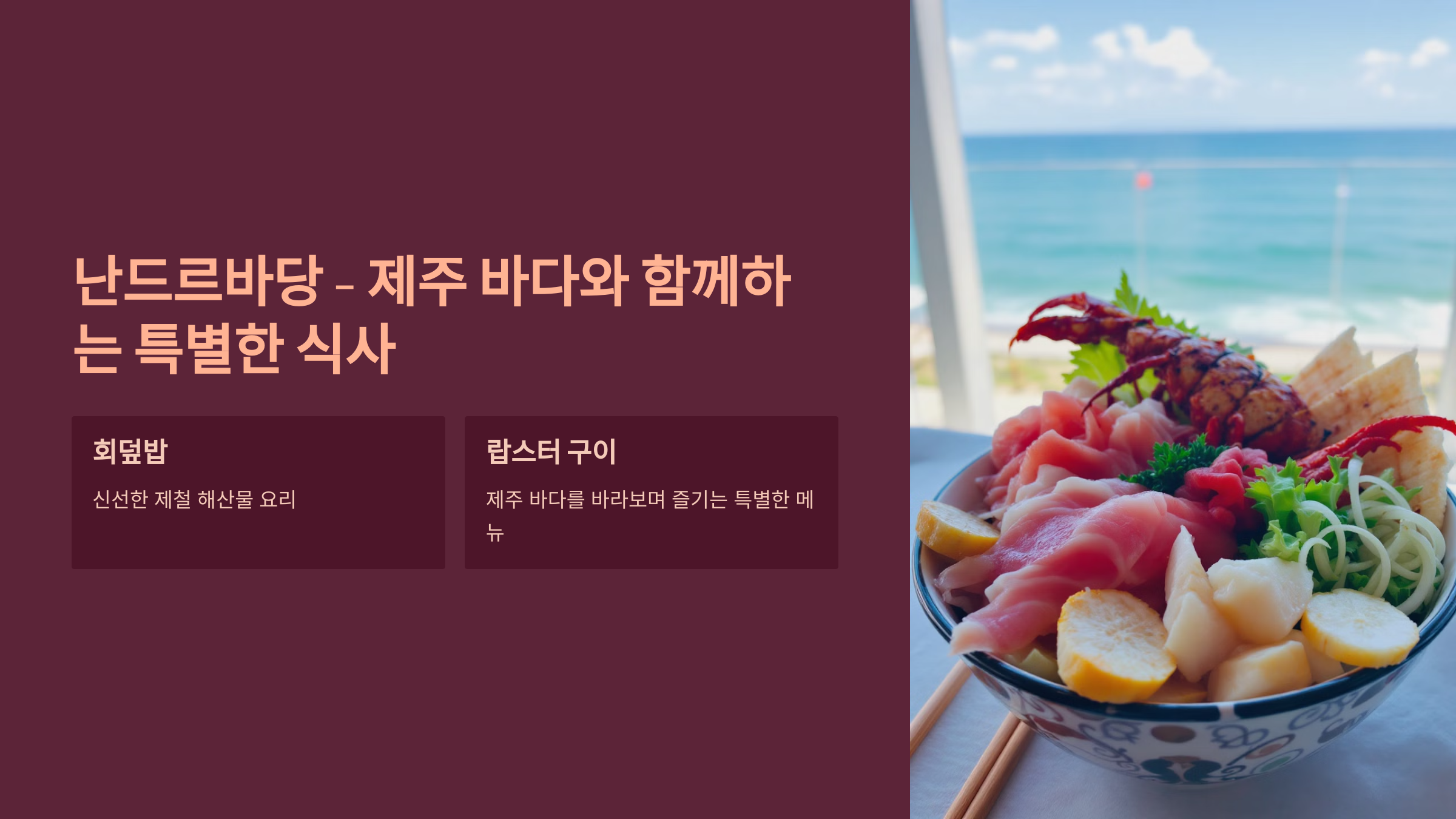 이곳은 제주 바다를 바라보며 제철 해산물 요리를 즐길 수 있는 레스토랑입니다.