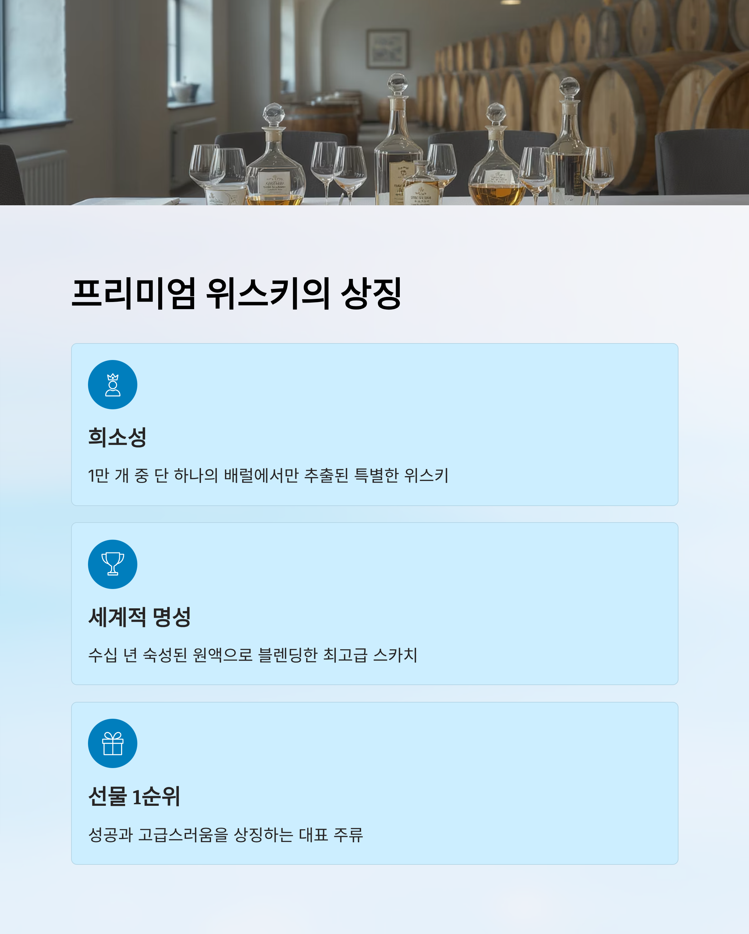 이 제품은 오직 1만 개 중 하나의 배럴에서만 추출된 위스키로 블렌딩된다고 알려져 있어요. 한 병을 만들기 위해 수십 년 된 위스키와 진귀한 재료가 조화롭게 사용되기 때문에, 가격대도 상당히 높고, 특별한 날 선물용으로 많이 선택된답니다.