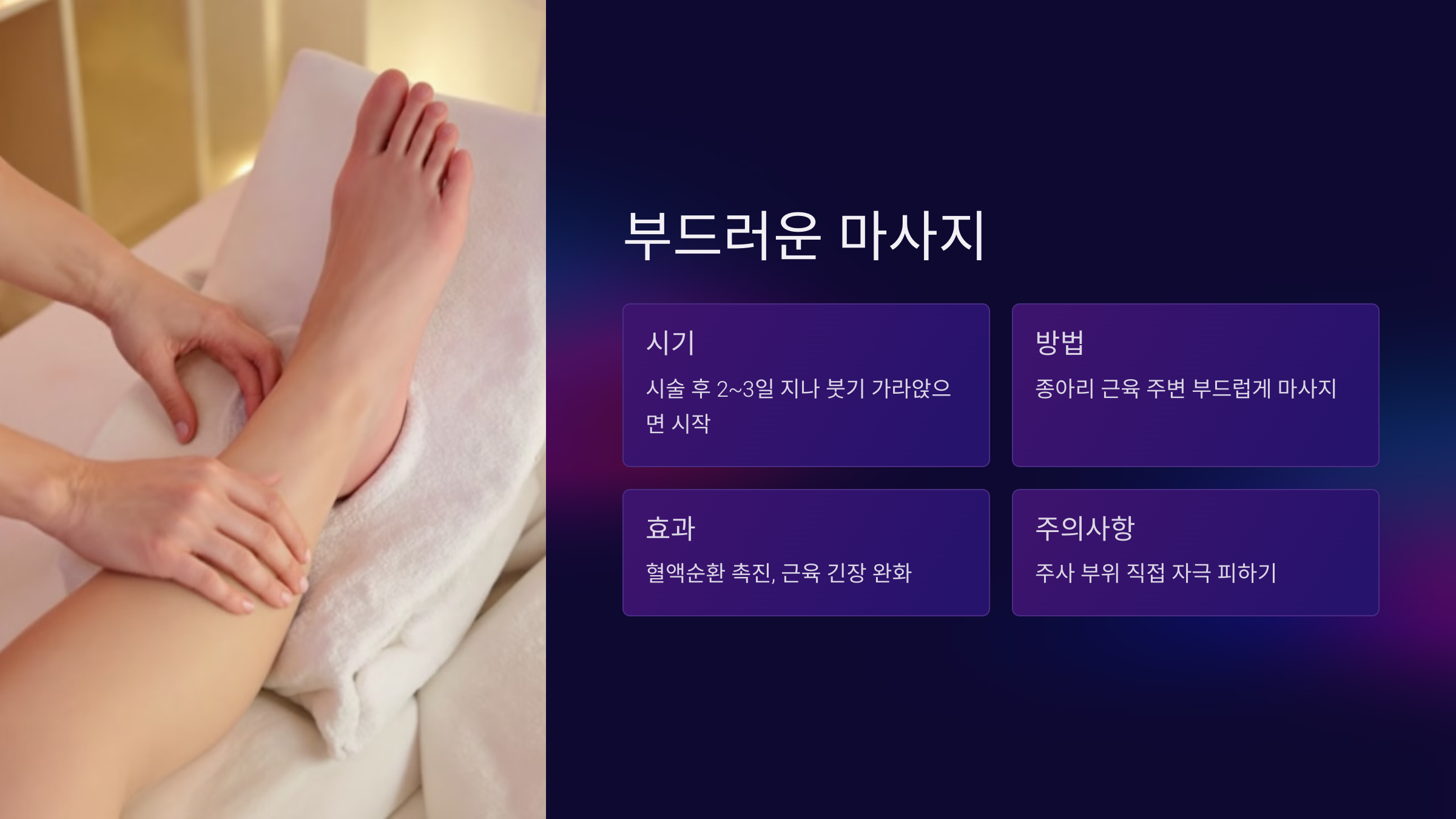 시술 후 2~3일이 지나 붓기가 조금 가라앉았다면, 종아리 근육 주변을 부드럽게 마사지해 보세요.