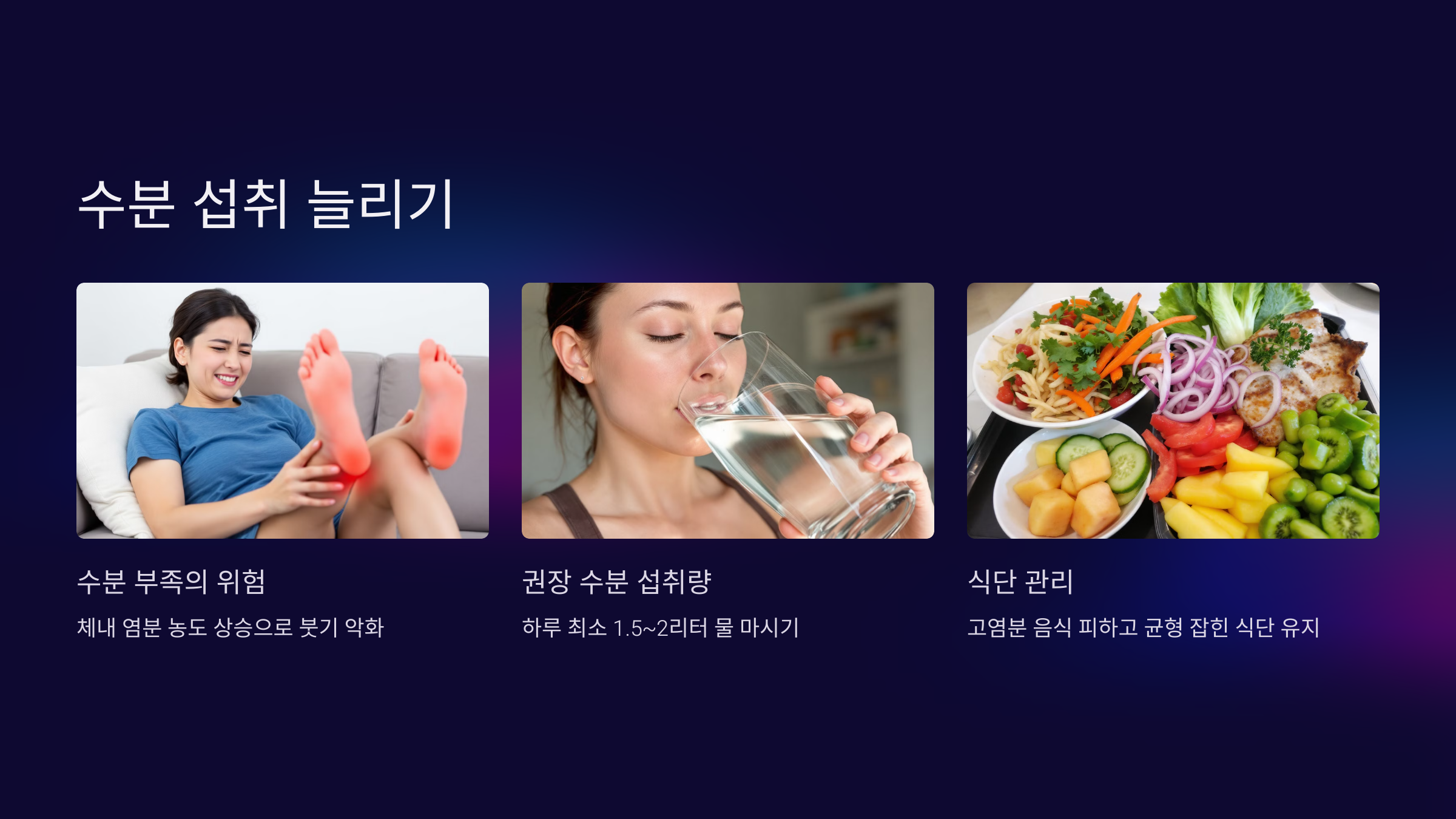 - 염분이 높은 음식은 피하고, 균형 잡힌 식단을 유지하세요.