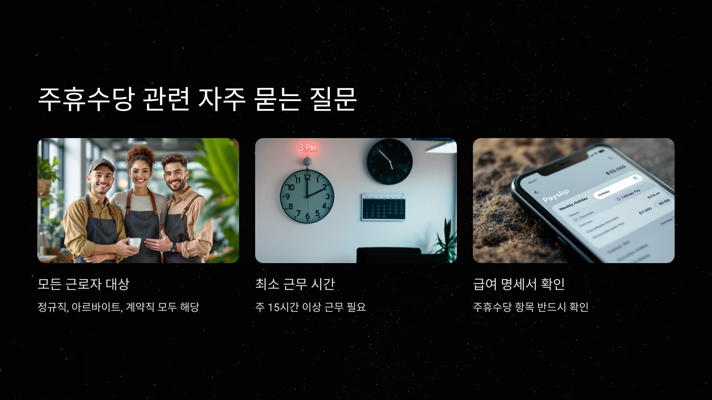 - 주휴수당은 주당 15시간 이상 근무한 근로자에게만 지급됩니다.