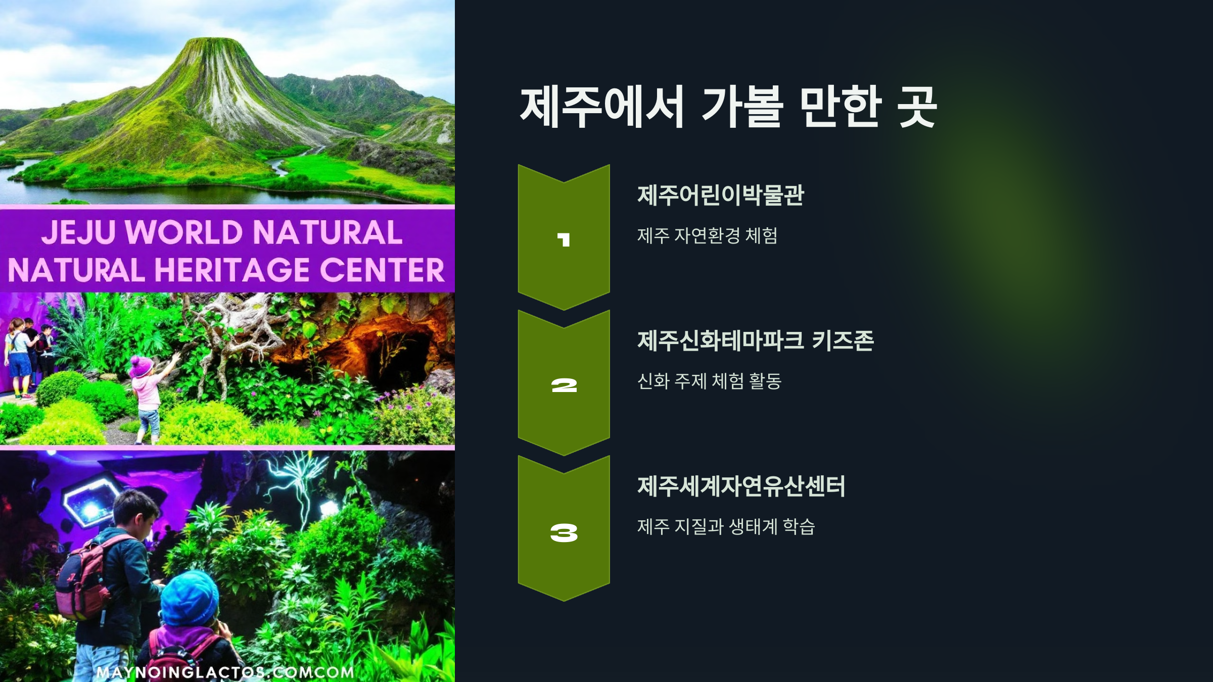한편, 제주세계자연유산센터는 제주도의 자연유산과 생태계를 배울 수 있는 독특한 박물관이에요. 이곳에서는 제주도의 지질과 생물 다양성에 대한 전시와 체험 활동을 통해 아이들이 자연을 이해하는 시간을 가질 수 있어요.