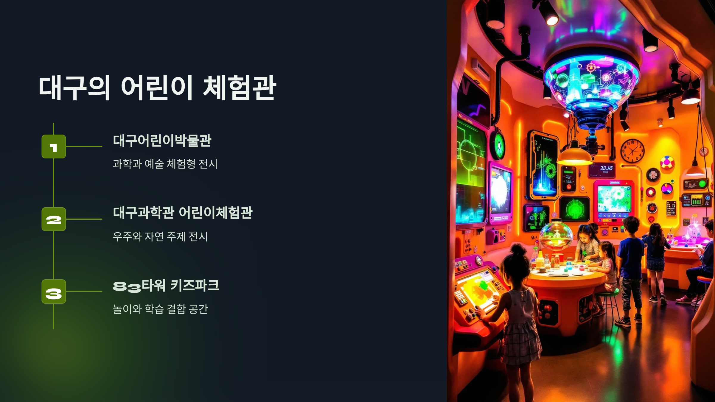 대구 지역의 어린이박물관은 비교적 넓은 공간과 다양한 체험 프로그램으로 아이들에게 풍부한 경험을 제공한답니다. 도심과 가까워 접근성도 뛰어나요!
