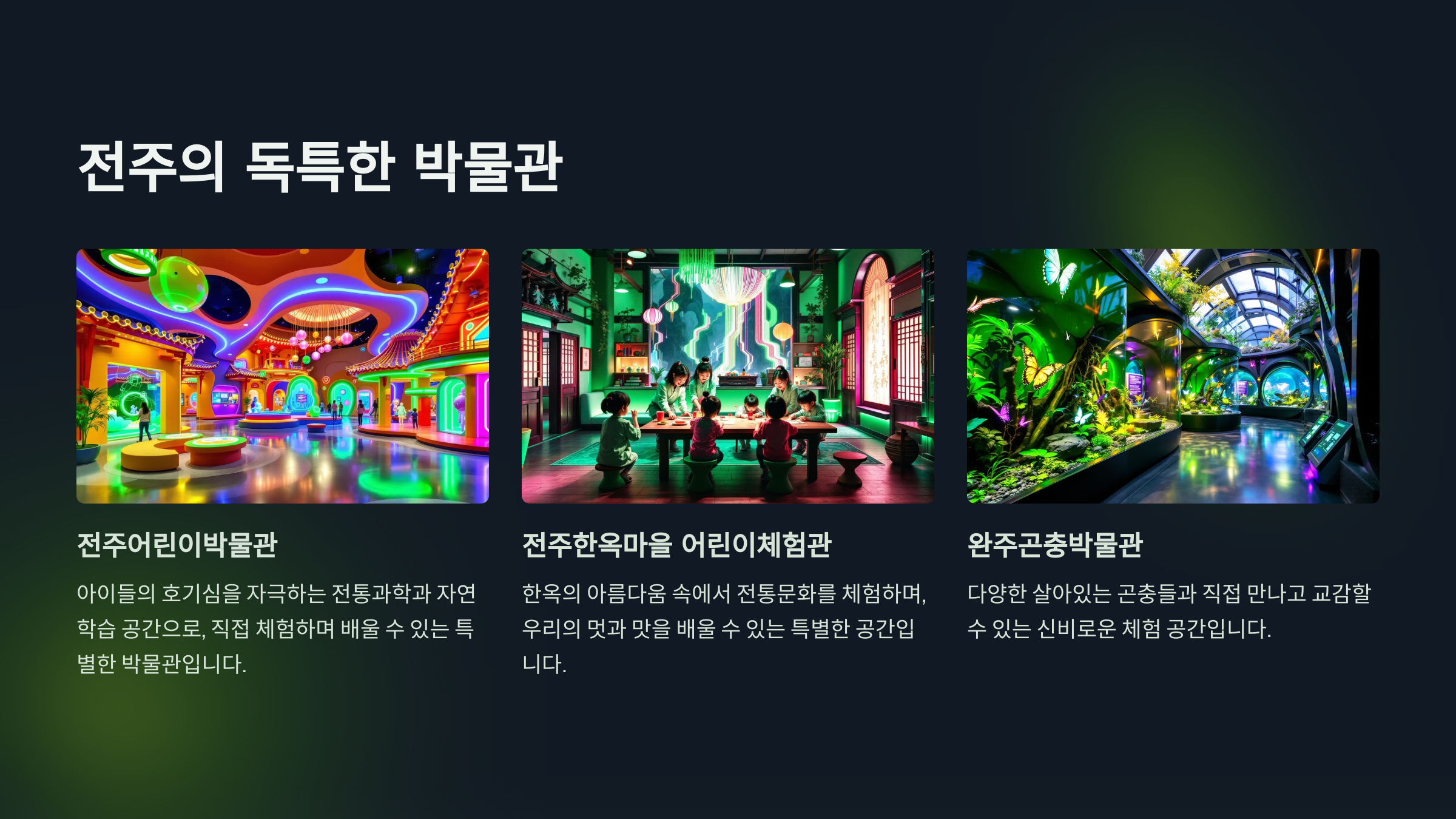 전주의 어린이박물관들은 역사와 자연을 주제로 한 독특한 프로그램이 많아 교육적이면서도 즐거운 시간이 될 거예요. 전주 여행을 계획한다면 꼭 포함해 보세요!