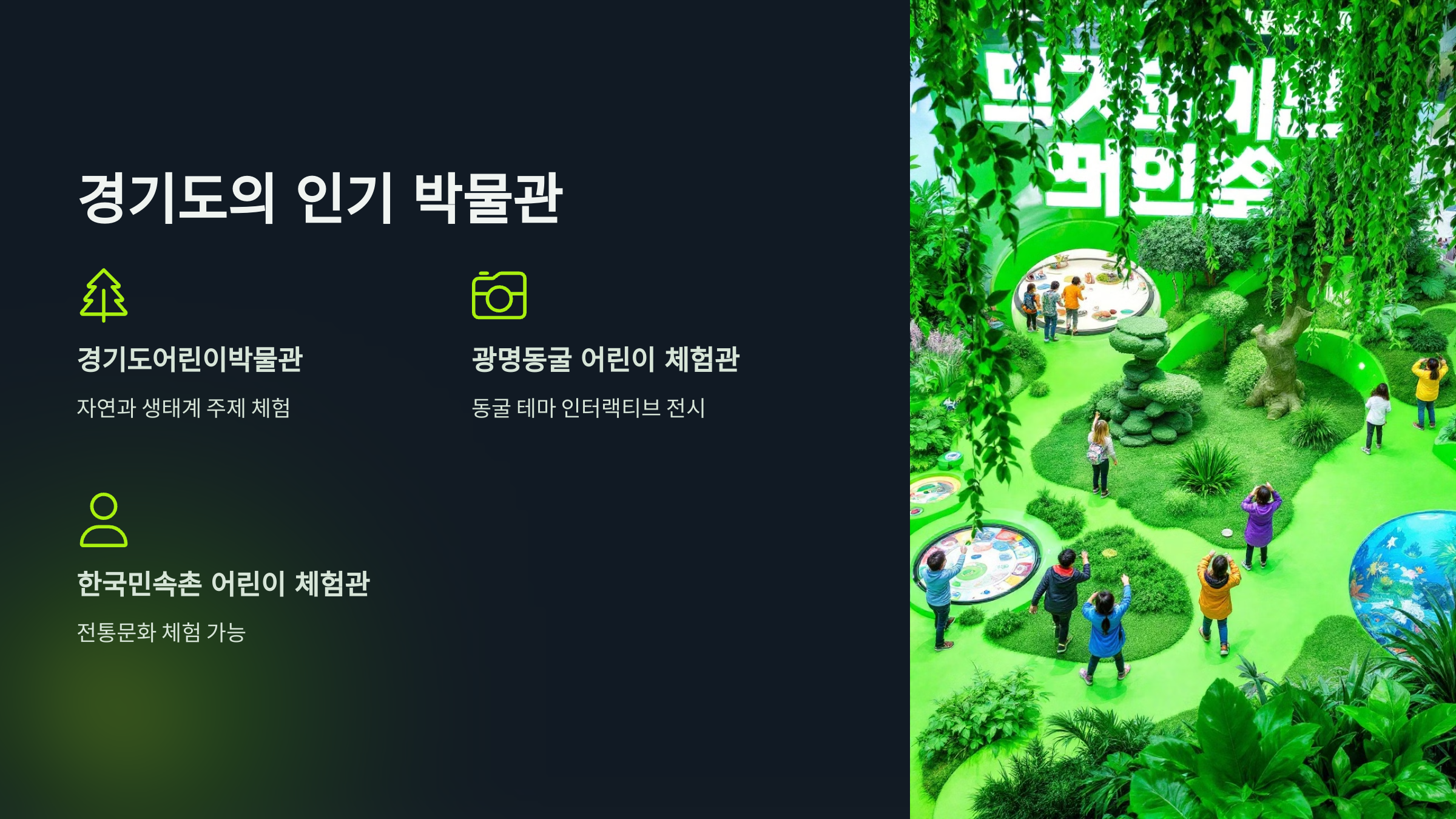 경기도는 서울보다 넓은 지역적 이점을 활용해, 어린이들이 자연 속에서 체험할 수 있는 박물관이 많아요. 가장 먼저 소개할 곳은 경기도어린이박물관이에요. 이곳은 체험형 전시와 환경 교육을 결합한 활동으로 유명해요. 특히, 자연과 생태계를 주제로 한 공간이 많아 아이들이 자연과 친해질 수 있답니다.
