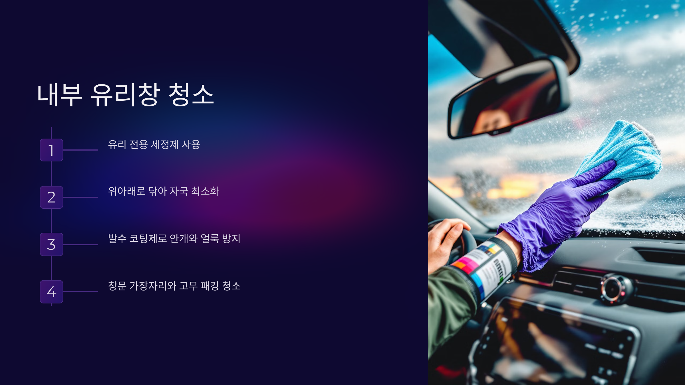 유리창이 깨끗하면 운전 시 시야 확보에도 도움이 됩니다.
