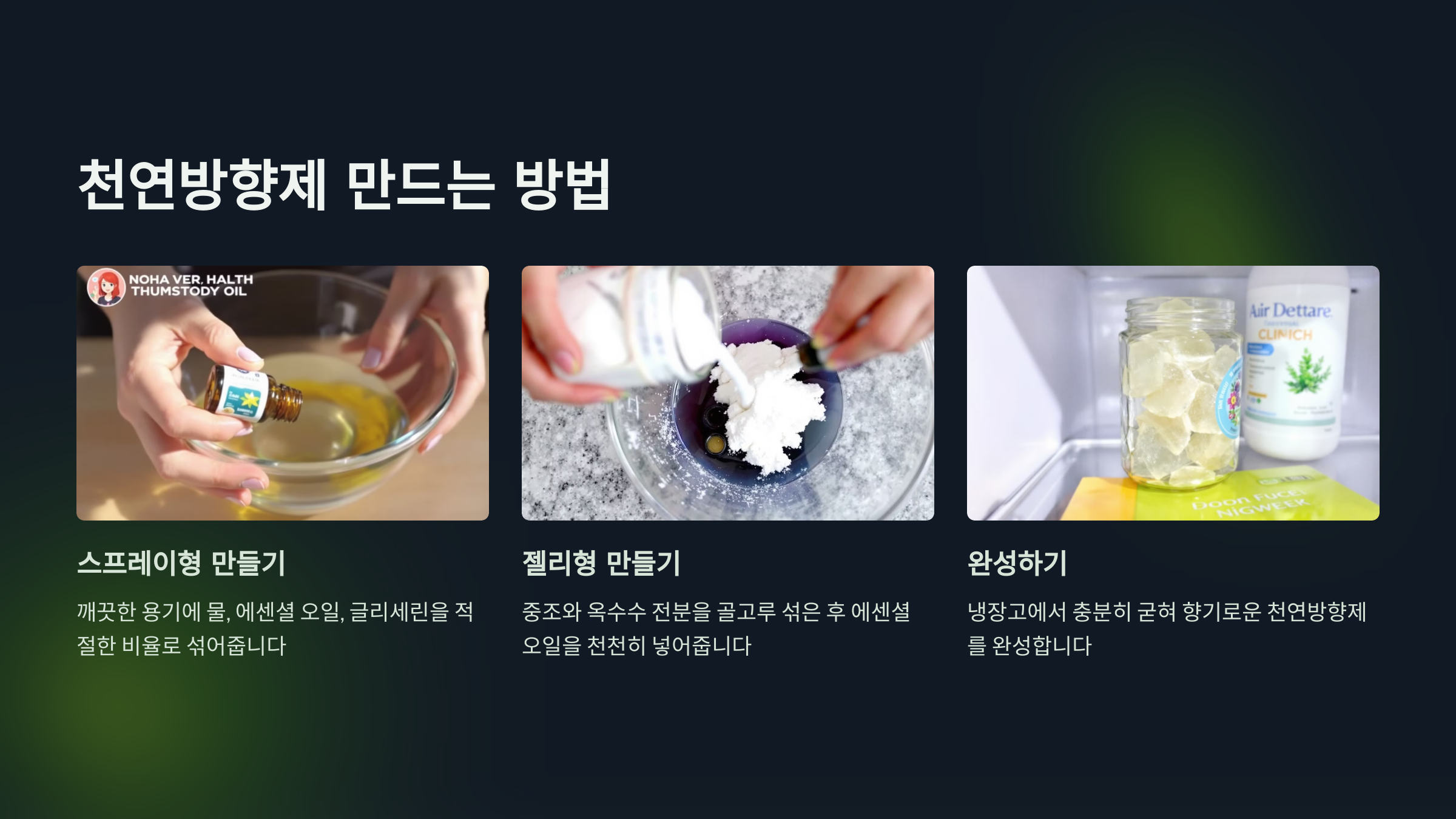- 에센셜 오일 선택: 천연 에센셜 오일을 선택하세요. 합성 향료는 천연방향제의 의미를 잃게 만듭니다.
