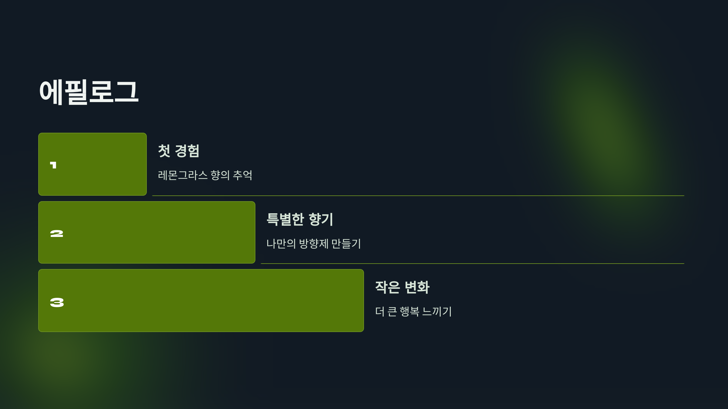 처음 천연방향제를 만들었던 날을 아직도 기억해요. 은은한 레몬그라스 향이 방 안을 감싸던 순간, 세상에서 가장 뿌듯했답니다. 오늘 소개해드린 방법으로 여러분도 특별한 향기를 만들어보세요. 작은 변화를 통해 더 큰 행복을 느낄 수 있답니다. 😊 천연방향제를 만들어본 적이 있나요? 어떤 향이 가장 마음에 드셨는지 댓글로 공유해주세요! 여러분의 노하우도 다른 독자들에게 큰 도움이 될 거예요.