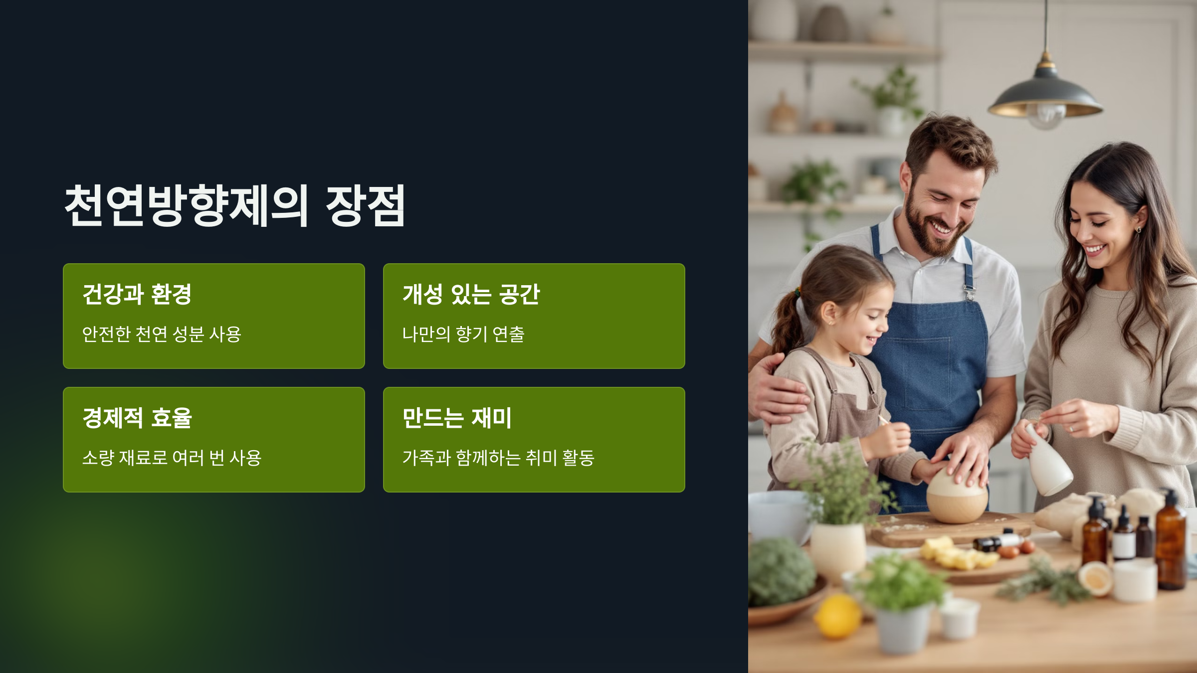저도 몇 년 전 시중 제품을 사용하다가 피부 트러블이 생긴 적이 있었어요. 그때부터 천연방향제에 관심을 가지기 시작했고, 지금은 집 안 구석구석에 제가 만든 천연방향제를 사용하고 있답니다. 향기롭고 건강한 공간을 만드는 기쁨을 함께 느껴보세요!